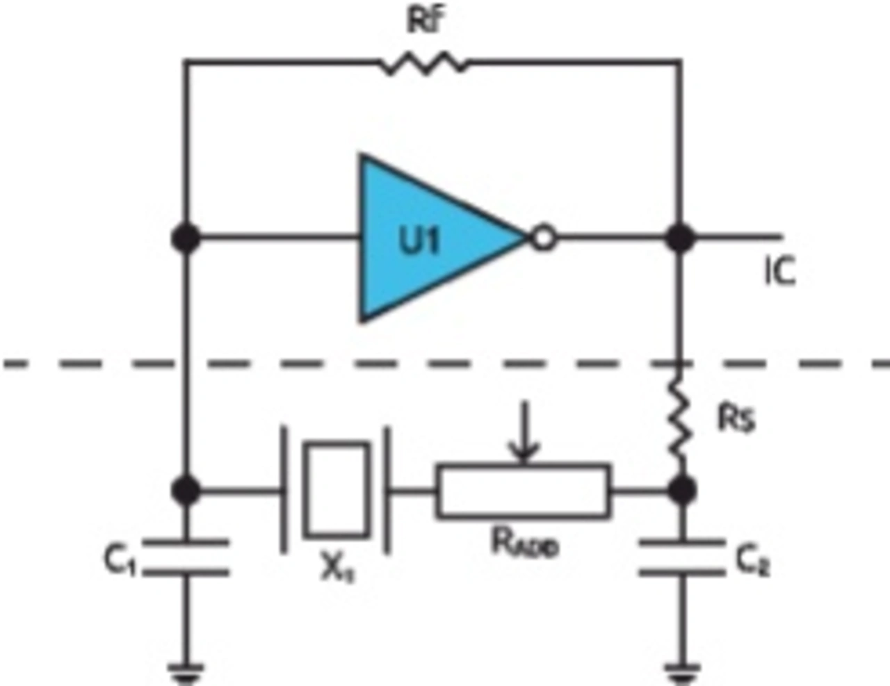 Der negative Widerstand (R1) der Oszillatorschaltung kann durch Hinzufügen eines Potenziometers in Reihe mit dem Quarz gemessen werden (Bild 2). Der Widerstand des Potenziometers wird dann so lange erhöht, bis der Quarz aufhört zu schwingen – dieser Widerstandswert markiert RADDmax, der addiert mit dem maximalen ESR-Wert des Quarzes den negativen Widerstand ergibt.