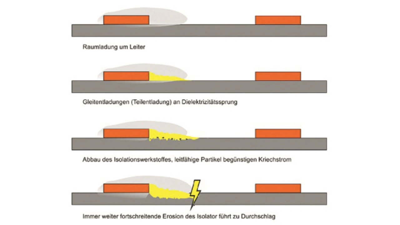 Im Folgenden beleuchten wir drei Ausfallmechanismen: Teilentladung, Kriechstrom und frequenzinduzierte Materialermüdung. Alle diese führen zwar schlussendlich dazu, dass die Isolation versagt, haben aber unterschiedliche Ursachen. Das gilt selbst für dünne Schichten von wenigen Zehntel Millimetern (Isolationsfolien, Lackschichten), denn schon bei Spannungen von 1000 V (AC) und 1500 V (DC) werden diese elektrisch massiv belastet.