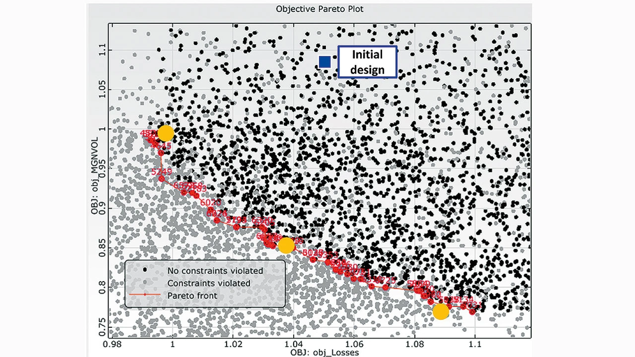 Das Simulationsteam verifizierte auch die beste Magnetanordnung zur Erfüllung der Leistungsanforderungen bei gleichzeitiger Minimierung der Gesamtverluste und des Magnetvolumens (Bild 7). Das Ergebnis, eine Kombination spezifischer Magnetabmessungen, stellte eine Reduktion des Magnetvolumens um 23 % im Vergleich zum ursprünglichen Entwurf dar.