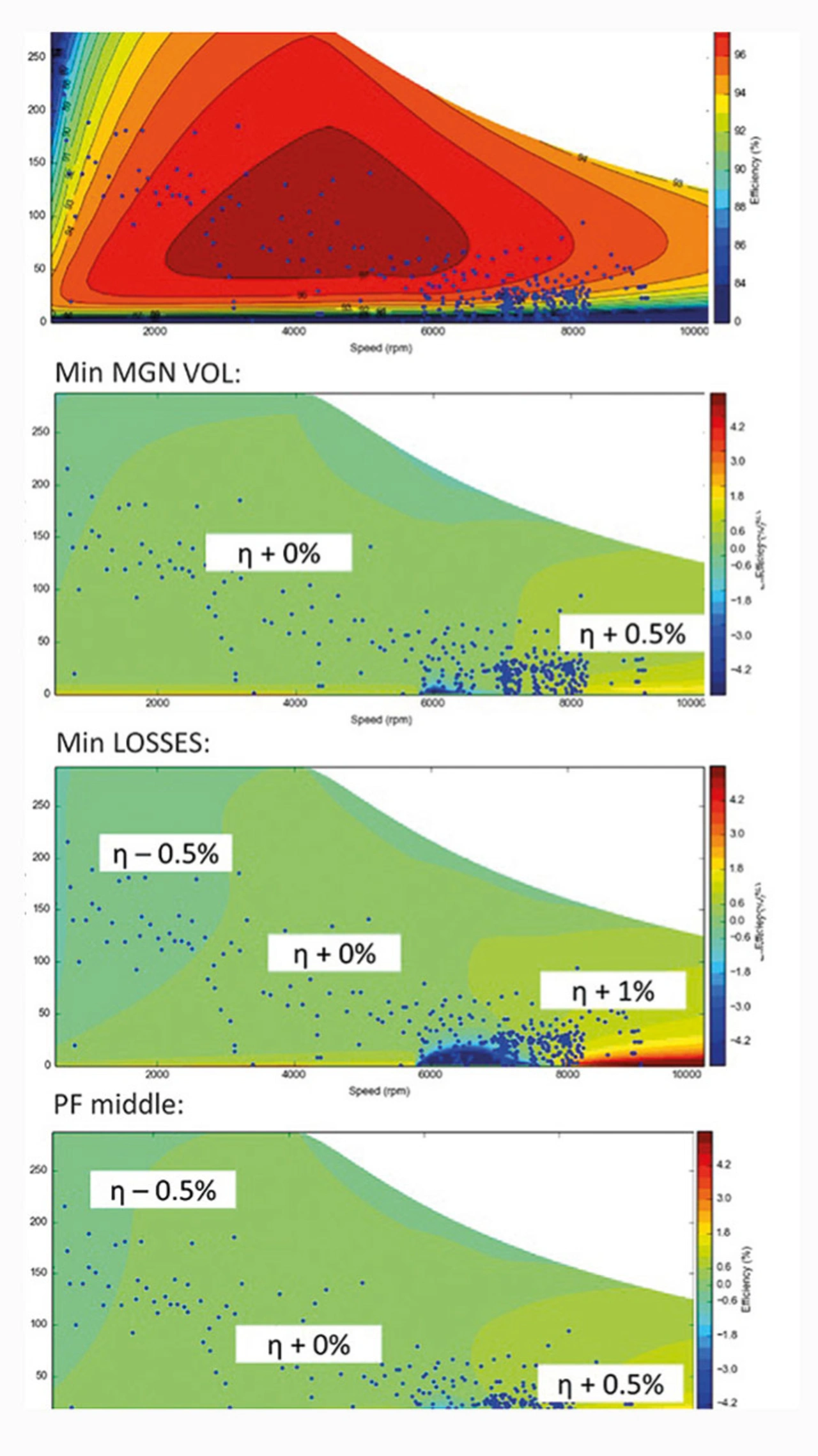 Damit simulierte das Team insgesamt 100 verschiedene Geometrien und bewertete die Auswirkung jeder Entwurfsvariable, einschließlich der Magnetdicke, an jedem Betriebspunkt. Das Metamodell berücksichtigte als Optimierungsziel auch den Gesamtenergieverlust über den gesamten Arbeitszyklus. Mit einem der in Ansys Motor-CAD eingebetteten Arbeitszyklen konnten die Simulationsingenieure dann auch die integrierten Wärmeverluste für alle weiteren Arbeitszyklen bewerten.