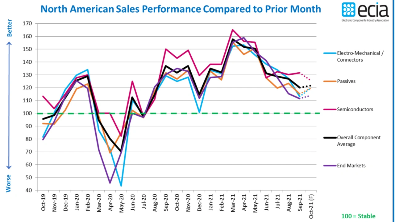 Die jüngsten Ergebnisse der Umfrage der Electronic Components Industry Association (ECIA) zu den Absatztrends bei elektronische Bauelementen (Electronic Component Sales Trend, ECST) für September und das dritte Quartal 2021 deuten darauf hin, dass sich das Wachstum in den letzten Monaten offenbar stabilisiert hat, nachdem die Wachstumserwartungen in den letzten 20 Monaten stark geschwankt hatten. Der Mittelwert des Indexes für die Wachstumserwartungen für Bauelemente insgesamt schwankte zwischen 120,0 und 127,0 zwischen September und dem Ausblick für Oktober (Bild 1). Im selben Zeitraum bewegten sich die Wachstumserwartungen für die Endmärkte zwischen 111,4 und 115,4 (violette Linie in Bild 1).