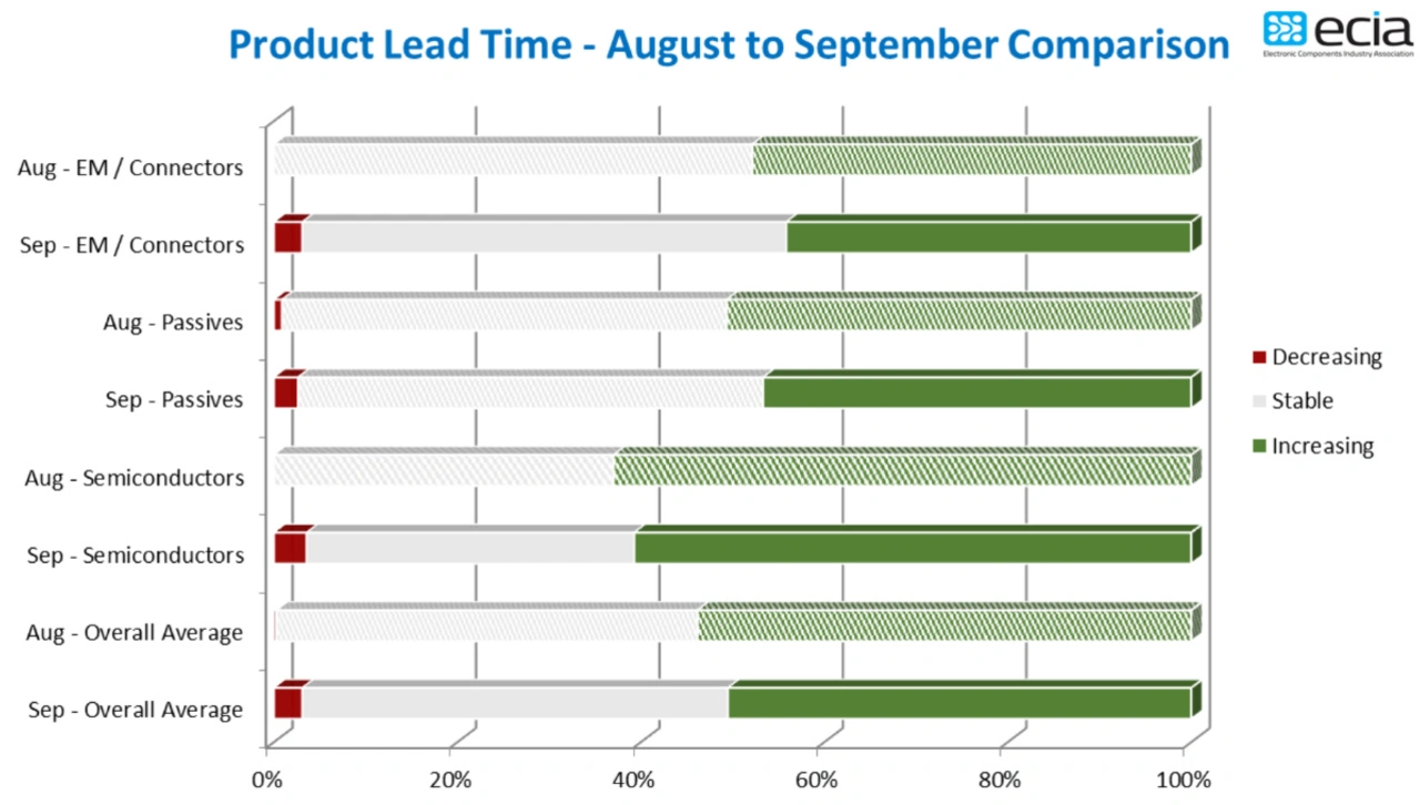 Die im vollständigen Bericht enthaltenen Daten zeigen, dass diskrete Halbleiter, Kondensatoren und analoge ICs im August und September weiterhin am stärksten unter dem Druck der Lieferzeiten zu leiden hatten. Dennoch berichteten zwischen 66 und 93 Prozent der Befragten in der vierteljährlichen Umfrage über niedrige bis extrem niedrige Lagerbestände in allen Bauteilkategorien. DRAM- und Flash-Speicher litten bei den Lagerbeständen am stärksten unter dem Druck.