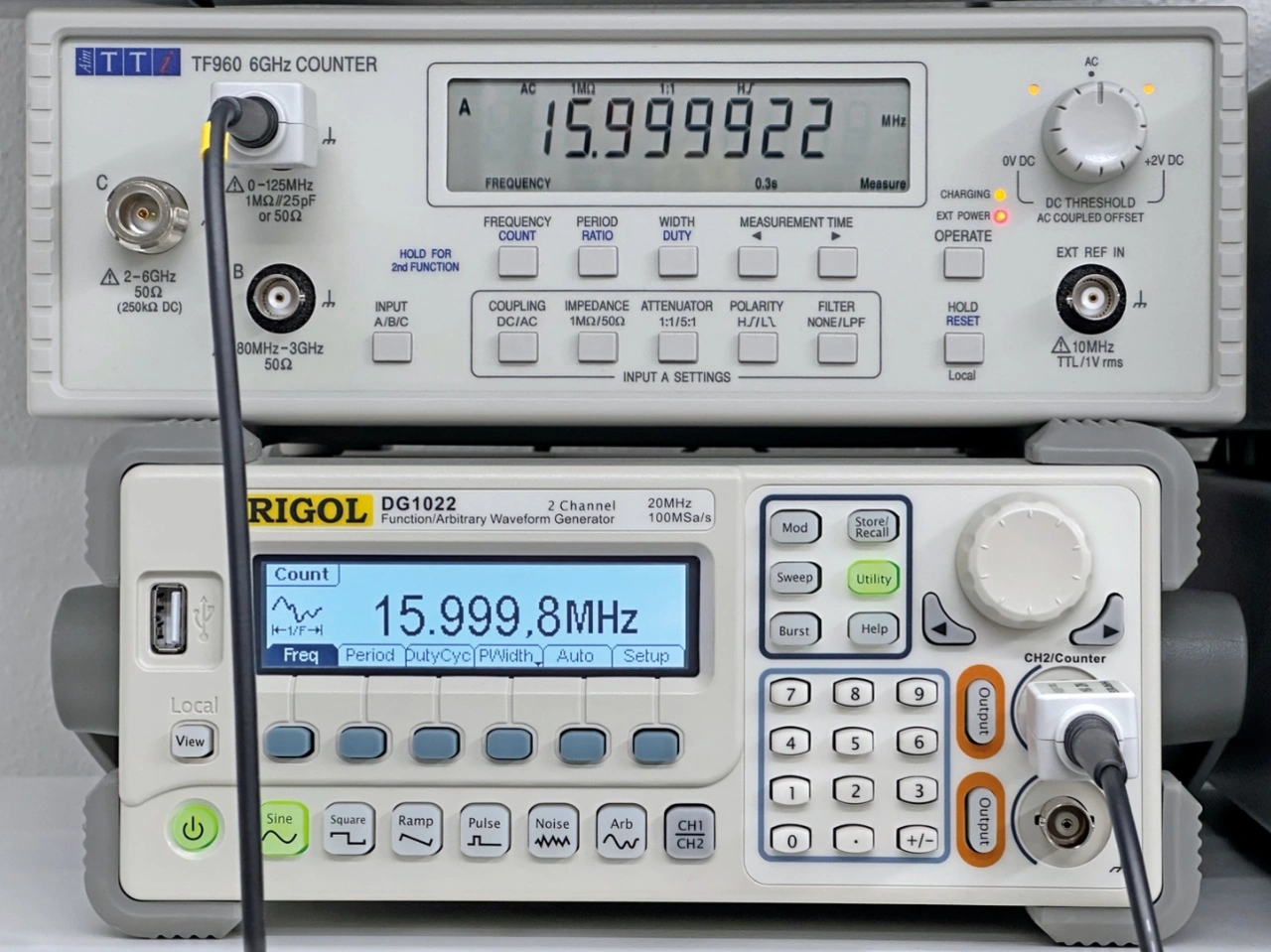 Quarzoszillatoren haben nur sehr geringe Frequenzabweichungen im Bereich von einigen ppm. Am Beispiel eines Oszillators mit der Nominalfrequenz von 16 MHz und einer Toleranz von +/- 50 ppm beträgt die zulässige Ausgangsfrequenz somit 15,999200 bis 16,000800 MHz. Hier wird schon anhand der Nachkommastellen schnell klar, dass eine Überprüfung mit der oft in Funktionsgeneratoren integrierten Frequenzzähler-Funktion kaum möglich ist. Dasselbe gilt noch viel mehr für eine Messung mit dem Digitaloszilloskop, dessen Messfunktion meist im Megahertzbereich nur zweistellig hinter dem Komma auflöst.
