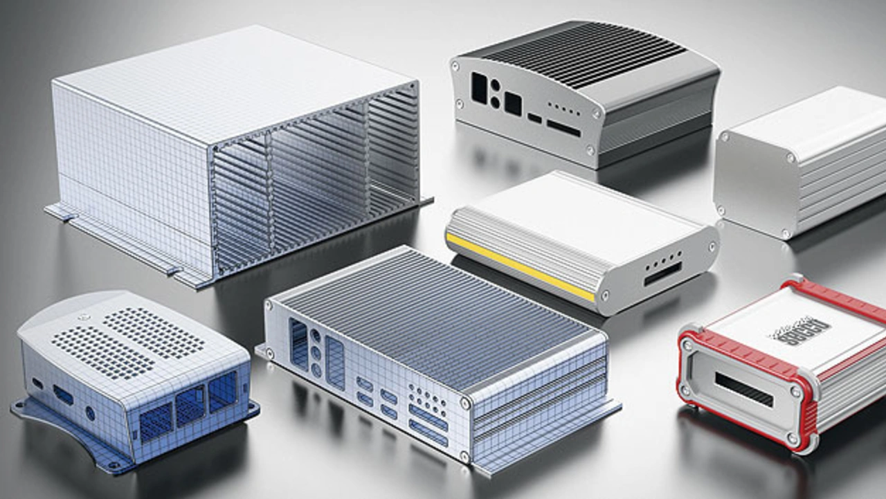 Wie der Name es schon verrät, werden Kombinationsgehäuse aus mehreren Gehäuseteilen kombiniert. Genauer gesagt bestehen diese Gehäuse aus zwei stranggepressten Aluminiumprofilabschnitten, die aufeinander gesetzt und mittels 2 mm starker Deckelplatten verschlossen werden. Die Besonderheit dieser Gehäuseserie besteht darin, dass sich durch die Vielzahl an Profilgeometrien ein für nahezu jede beliebige Anwendung passendes Gehäuse generieren lässt. Es stehen Multifunktionsprofile mit Kühlrippen, Führungsnuten, T-Nuten, Hutschienenklammern und weiteren Funktionen in verschiedenen Dimensionen zur Verfügung (Bild 2).