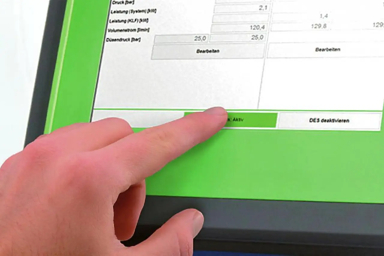 Für die manuelle Bedienung des Coolant Controller riet der Gehäuselieferant zum Einsatz eines resistiven Touchscreen (Bild 4), der auf Druck reagiert, indem zwei elektrisch leitfähige Schichten stellenweise miteinander verbunden werden. Gegenüber der Verwendung von Tastern hat diese Art eines berührungsempfindlichen Bildschirms wesentliche Vorteile: Der Platzbedarf und der Verkabelungsaufwand sind zum einen deutlich geringer, zum anderen weist der Touchscreen die gleiche Schutzart wie das Gehäuse auf. Darüber hinaus lässt sich die gesamte Fläche des Touchscreen zur visuellen Darstellung benutzen. Grindaix zeigt sich mit dem Ergebnis der Zusammenarbeit sehr zufrieden.