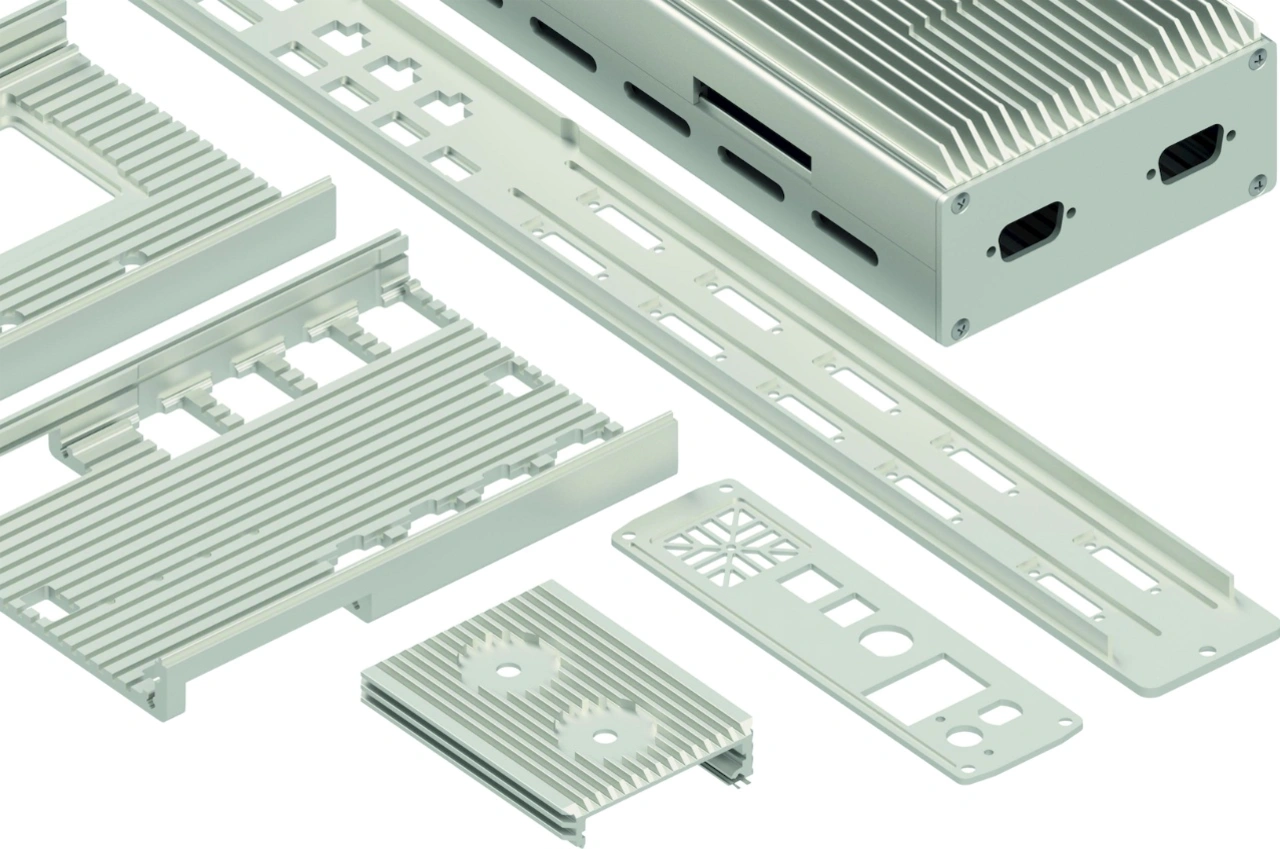 Benötigen Kunden nicht nur eine variable Gehäuselänge, sondern auch eine kundenspezifische Breite, so bieten sich Gehäuse an, deren Seitenwände aus Profilen bestehen und mittels Deck- und Bodenblech kombiniert werden. Die front- und rückseitigen Deckelplatten sowie die Deck- und Bodenbleche lassen sich vergleichsweise einfach in verschiedenen Abmessungen fertigen (Bild 2).