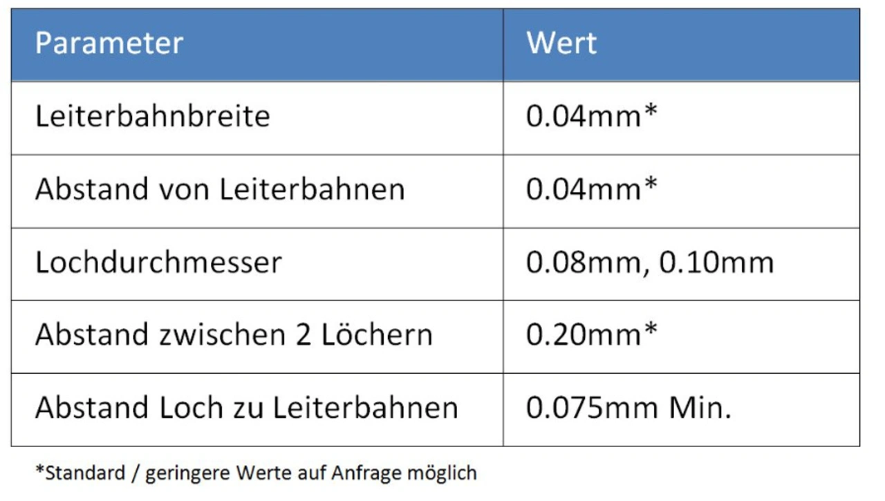 Die LTCC-Technologie von Koa ermöglicht eine präzise Dünnschicht-Strukturierung auf der Ober- und Unterseite des Substrats. Außerdem können bis zu 30 Lagen übereinander gestapelt werden. Tabelle 1 zeigt die generellen Entwurfregeln (Bild 2).