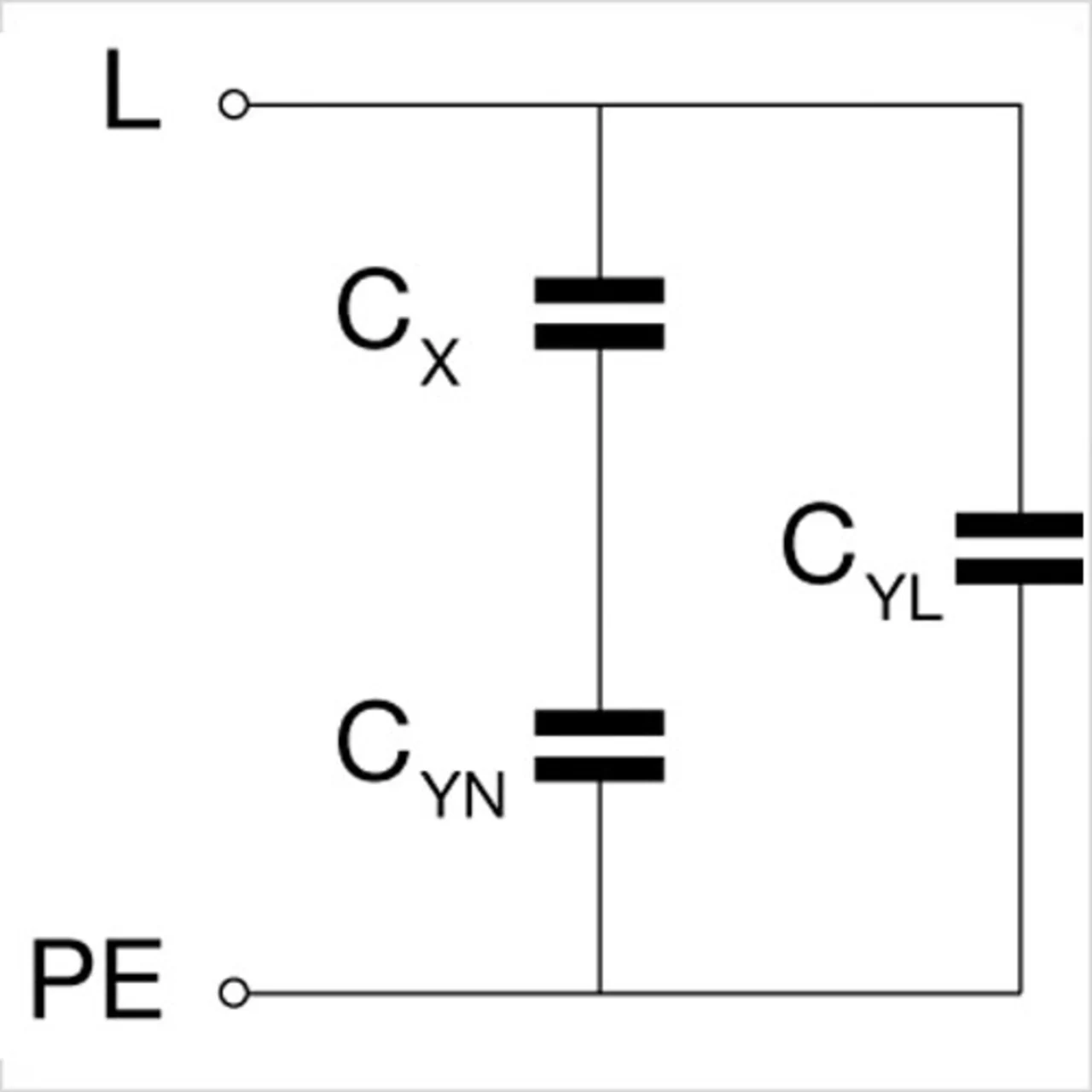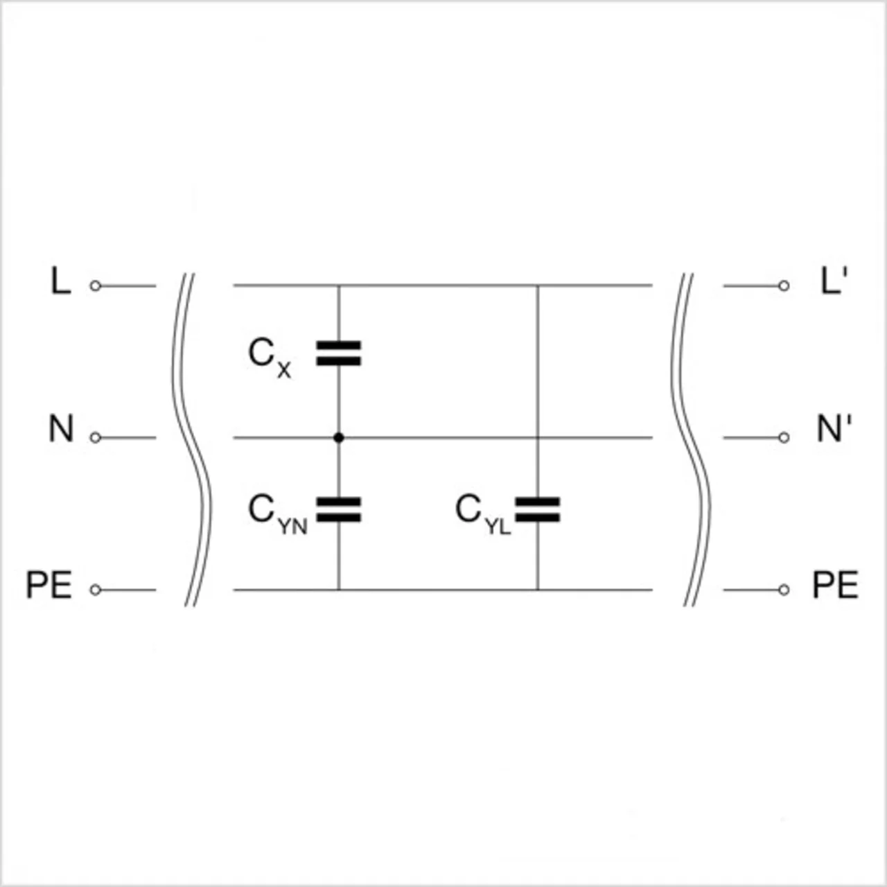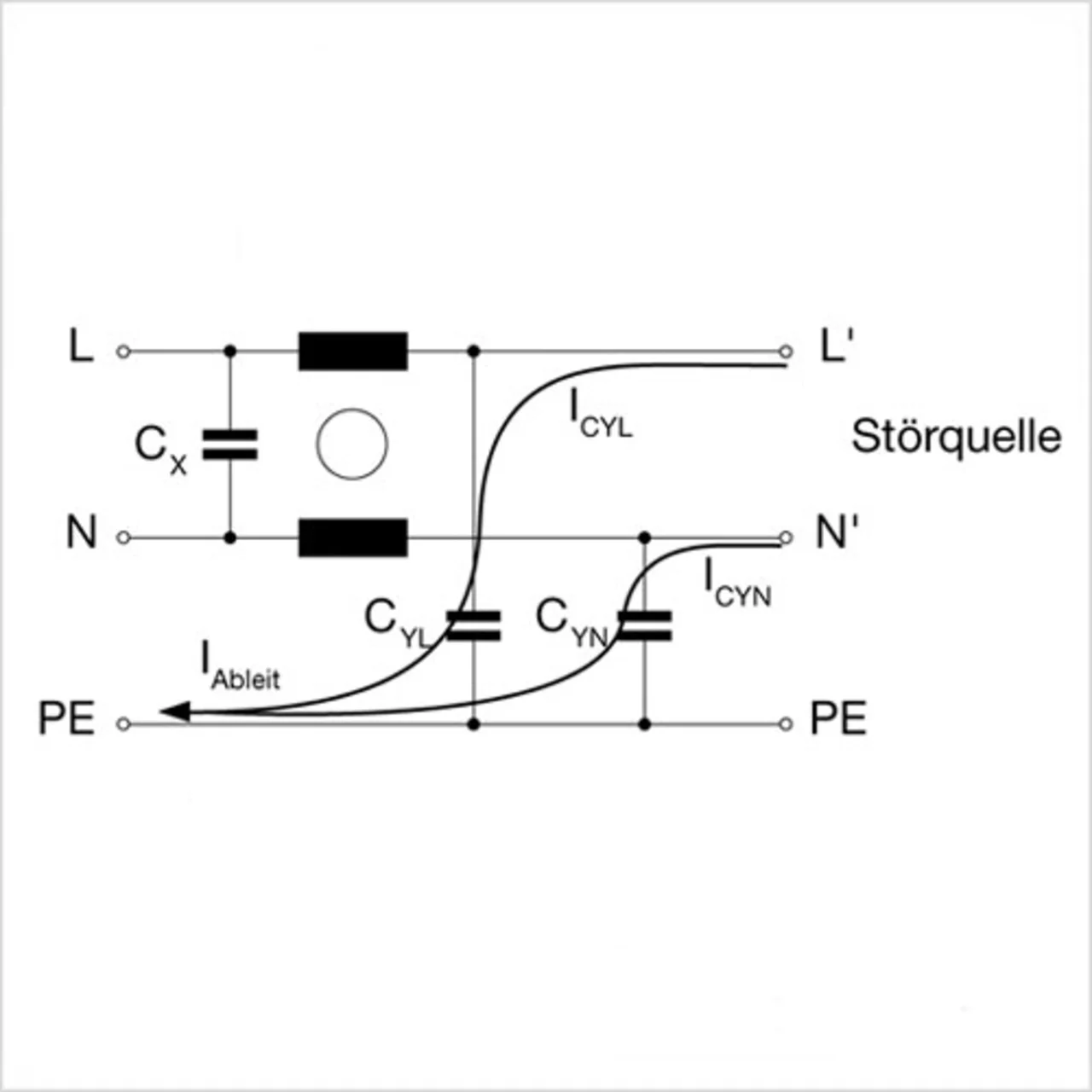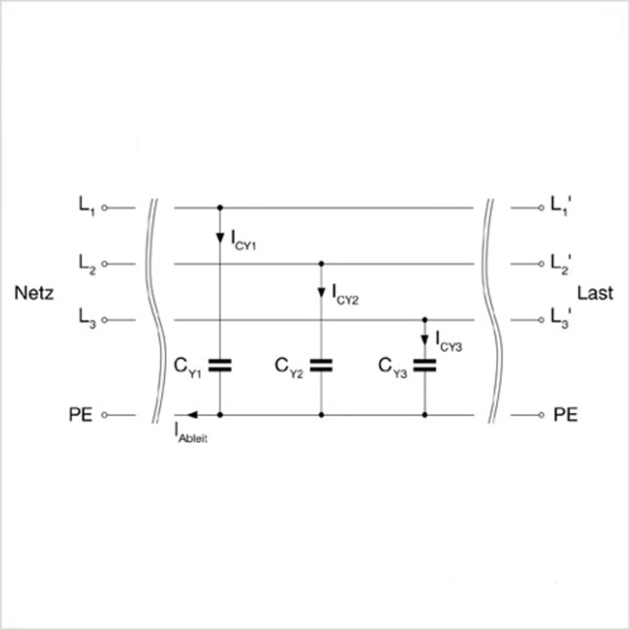 Symmetrische Störungen lassen sich mit X-Kondensatoren reduzieren. Für die Dämpfung von asymmetrischen Störungen kommen für die tiefen Störfrequenzen stromkompensierte Drosseln, für die höheren Störfrequenzen Y-Kondensatoren zum Einsatz. Diese Y-Kondensatoren liegen je zwischen Phase/Neutralleiter und Schutzleiter und leiten die asymmetrischen Störungen von der Phase und des Neutralleiters über den Schutzleiter gegen Erde ab. Dadurch entstehen so genannte Ableitströme (Bild 1). Je größer die Kondensatoren, desto besser ist die Dämpfung des Filters und entsprechend höher sind auch die Ableitströme. Zusätzlich tragen parasitäre Koppelkapazitäten einer Anlage oder eines Gerätes sowie große Leitungslängen zum Ableitstrom des Filters bei. Dies führt zu einer Summe von Strömen, die durch den Schutzleiter fließen.