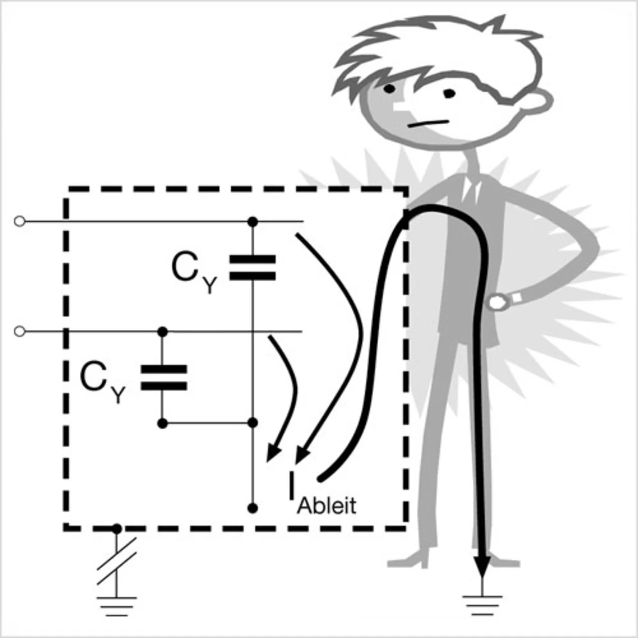 Diese Ableitströme können ein Sicherheitsrisiko darstellen. Je höher die Impedanz des Schutzleiters ist, desto größer ist das Sicherheitsrisiko für die Anwender. Berührt eine Person ein Gerät mit unterbrochenem Schutzleiter, fließt der Ableitstrom infolge der Unterbrechung über die Person gegen Erde ab (Bild 2).