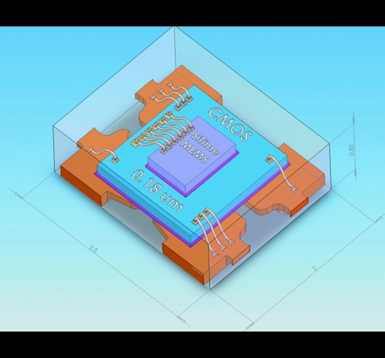 Nach dem Verdünnen und Vereinzeln der Wafer – in beiden Fällen handelt es sich um Standard-Prozessschritte – werden die MEMS-Resonatoren und die CMOS-Treiber-ICs in standardisierten Kunststoffgehäusen untergebracht. SiTime verwendet hierfür QFN-Kunststoff-Spritzguss-Gehäuse, um eine hohe Zuverlässigkeit, geringe Induktivität der Anschlussleitungen und ein gutes thermisches Betriebsverhalten zu erzielen. Außerdem zeichnen sich diese Gehäuse durch eine flexible Gestaltung der Kontaktflächen sowie durch hohe Zuverlässigkeit und geringe Kosten aus. Alle Oszillatoren sind wahlweise in den vier Standardabmessungen 2,5 × 2 mm² , 3,2 × 2,5 mm², 5 × 3,2 mm² oder 7 × 5 mm² erhältlich und je nach Größe lediglich 0,75 bis 0,9 mm hoch, wobei alle Gehäuse selbstverständlich auf die Anschlüsse normaler Leiterplattenlayouts für Quarzoszillatoren passen.