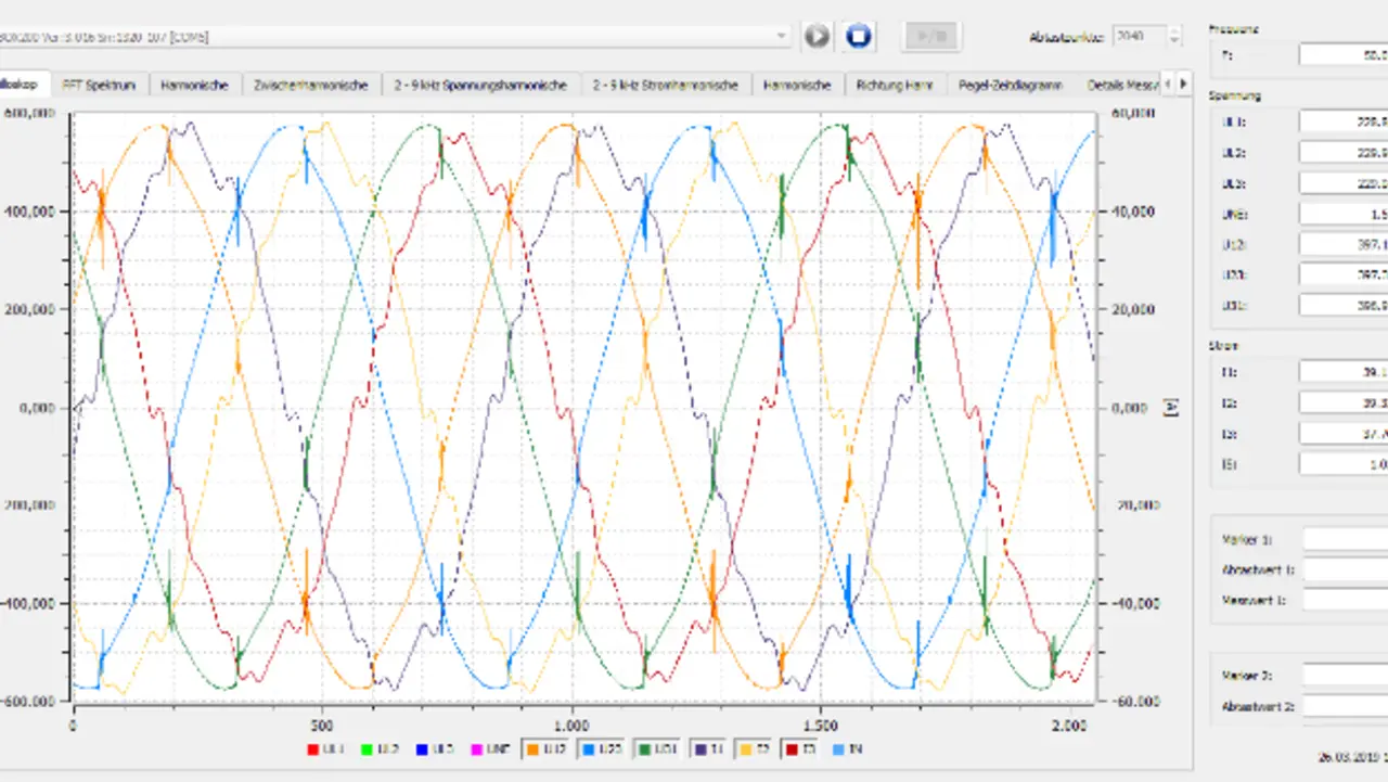 Oberschwingungsmessungen (OSM) im Feld sind nicht mit normativen Abnahmemessungen im Labor zu vergleichen. Die normgerechte Messung wird an synthetischen Stromversorgungsnetzen durchgeführt, was im Feld nicht möglich ist, da hier andere Versorger und Lasten mit am gleichen Einspeisestrang hängen. Daher muss vor der Messung mit dem zu prüfenden Objekt, in einer separaten Messung die Qualität des vorhandenen Netzes beurteilt werden. Im konkreten Fallbeispiel war das Netz mit den Antrieben der Lifte beaufschlagt, die über einen thyristorgesteuerten Sanft-Anlauf-Starter betrieben werden und einen typischen Kommutierungseinbruch bei einem 60°-Phasenwinkel erzeugen. Allein in dieser Betriebsart lag der ermittelte THD des Stroms bereits bei 7,3 Prozent. Die zur Messung verwendete PQ-Box (Power Quality) erkennt die Netzqualität und wertet dieses bei erkennbar schlechtem Netz nicht normativ aus. Somit war eine Diagnose durch die PQ-Box nur eingeschränkt möglich.