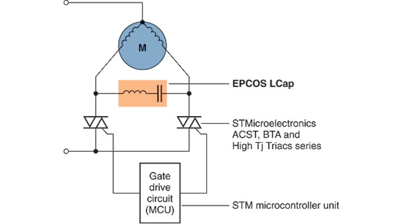 Für die wirtschaftliche Steuerung von bidirektionalen Wechselstrommotoren nutzt STMicroelectronics in seinem Referenz-Design die Vorteile des neuen Kombi-Bauelements Epcos LCap. Bei diesem sind ein Motorbetriebs-Kondensator und eine Drosselspule in einem robusten Gehäuse vergossen.