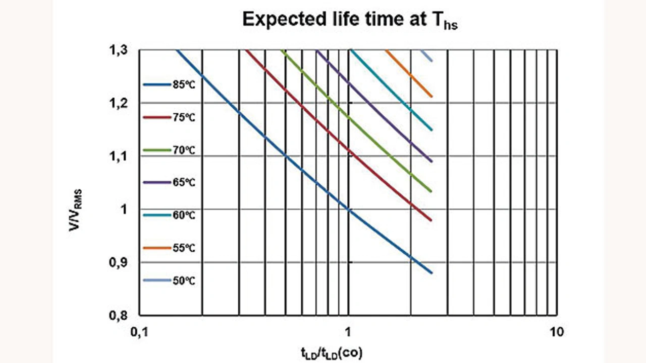 Ein weiterer entscheidender Aspekt ist die Lebensdauer von Kondensatoren mit der Standardausführung der Sicherheitseinrichtung. Die Lebensdauer der metallisierten Folie hängt wesentlich von der Nennspannung und der Hotspot-Temperatur (Ths) im Betrieb ab (Bild 3).