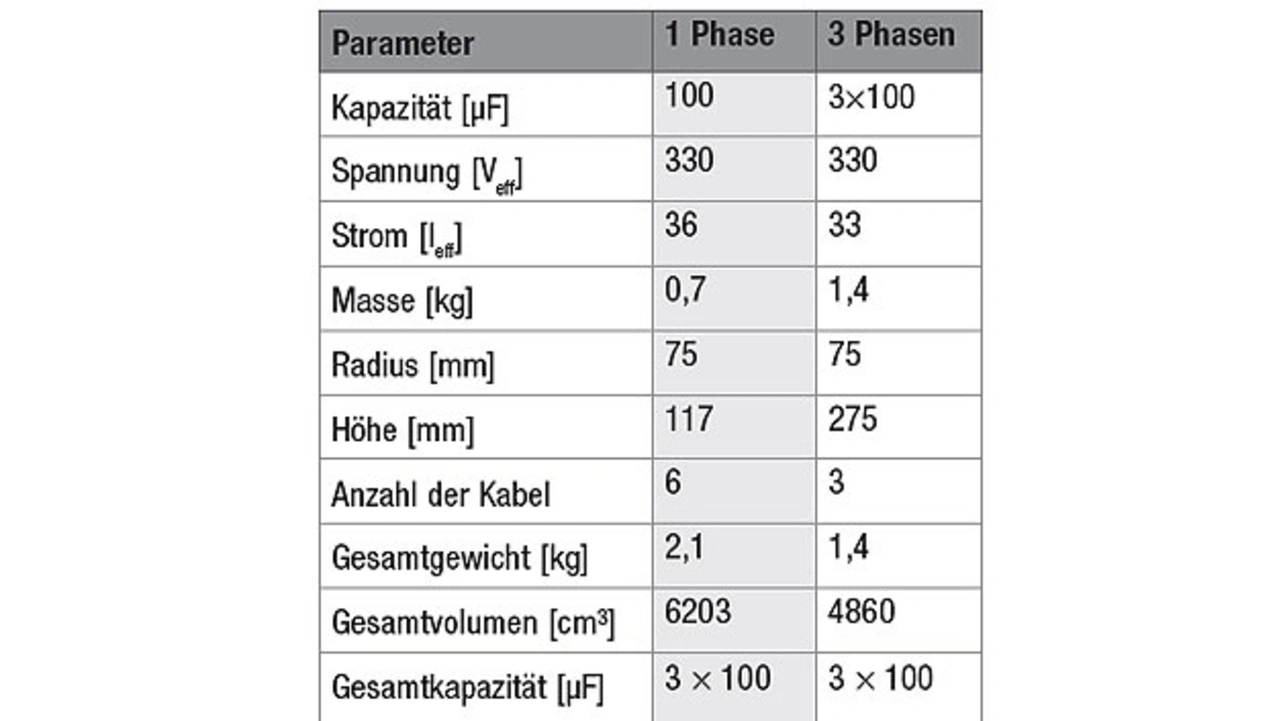Die Vorteile dreiphasiger Filterkondensatoren im Vergleich zu drei einphasigen Filterkondensatoren sind in Tabelle 1 zusammengefasst.