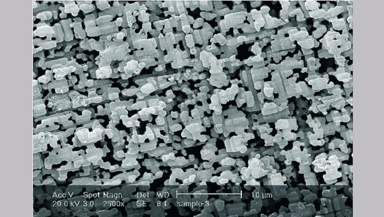 Formieren – Die Anodenfolie trägt die Dielektrikumsschicht aus Aluminiumoxid (Al2O3), welche in einem elektrochemischen Verfahren auf der aufgerauten Anodenfolie aufwächst. Das Verfahren wird als anodische Oxidation oder Formierung bezeichnet. Die Güte der Formierung ist dabei ein wesentlicher Schlüssel zur hohen Zuverlässigkeit der Bauteile im Betrieb. Bild 2 zeigt in diesem Zusammenhang eine elektronenmikroskopische Aufnahme der Oberfläche einer geätzten Hochvolt-Anodenfolie.
