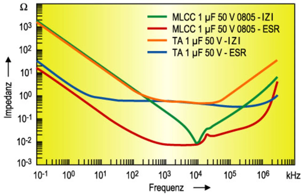 Impedanz und ESR in Abhängigkeit der Frequenz sind bei MLCC (Multilayer Ceramic Capacitor) und Tantal-Kondensatoren gleicher Kapazität verschieden (Bild 4). Bei kleineren Frequenzen bis zirka 100 kHz ist die Impedanz in etwa gleich, bei höheren Frequenzen nimmt sie bei MLCC weiter deutlich bis zur Resonanzfrequenz ab, während sie bei Tantal-Kondensatoren annähernd konstant bleibt. Grund dafür sind vor allem die rein metallischen Innenelektroden des MLCC, wohingegen beim Tantal-Kondensator Teile der Elektrode halbleitend und damit hochohmiger sind. Entsprechend geringer sind auch die ESR-Werte der Keramik-Kondensatoren, wodurch schnellere und verlustarme Ladungsvorgänge insbesondere bei höheren Frequenzen erzielt werden können.