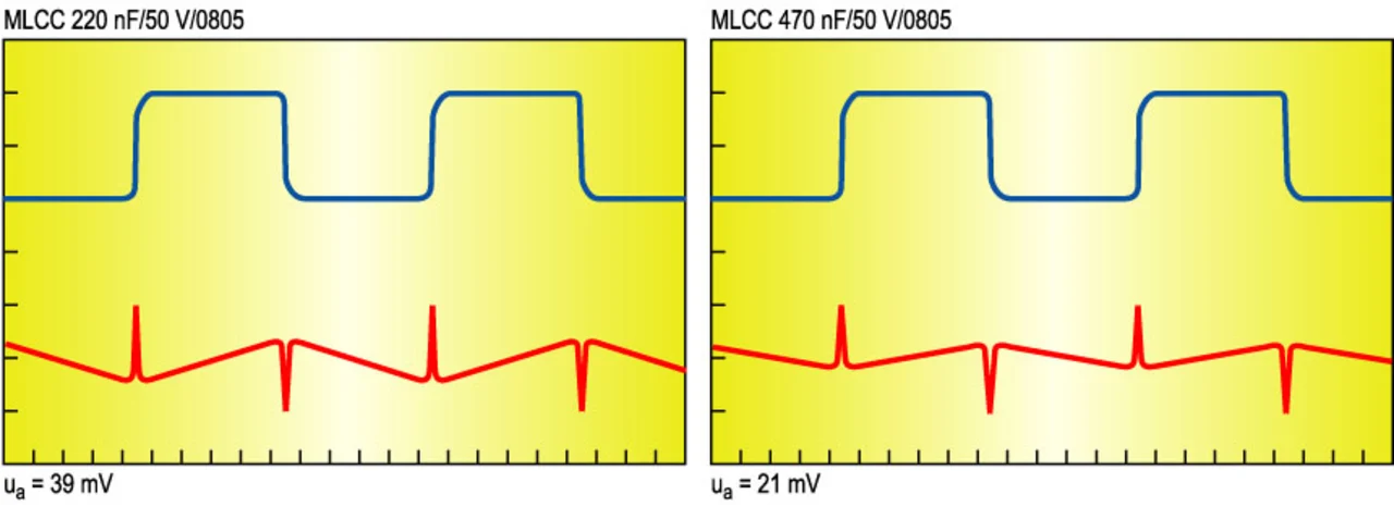 Andererseits erreicht man mit einem 470-nF-MLCC (Bild 6, rechts) bereits eine stärkere Dämpfung als mit dem 1-µF-Tantal-Kondensator (Bild 7, rechts). Mit einem 220-nF-MLCC (Bild 6, links) ist die Dämpfung wiederum etwas schwächer. Für das gewählte Beispiel wäre demnach ein 330-nF-MLCC ein geeigneter Äquivalentwert für einen 1-µF-Tantal-Kondensator.