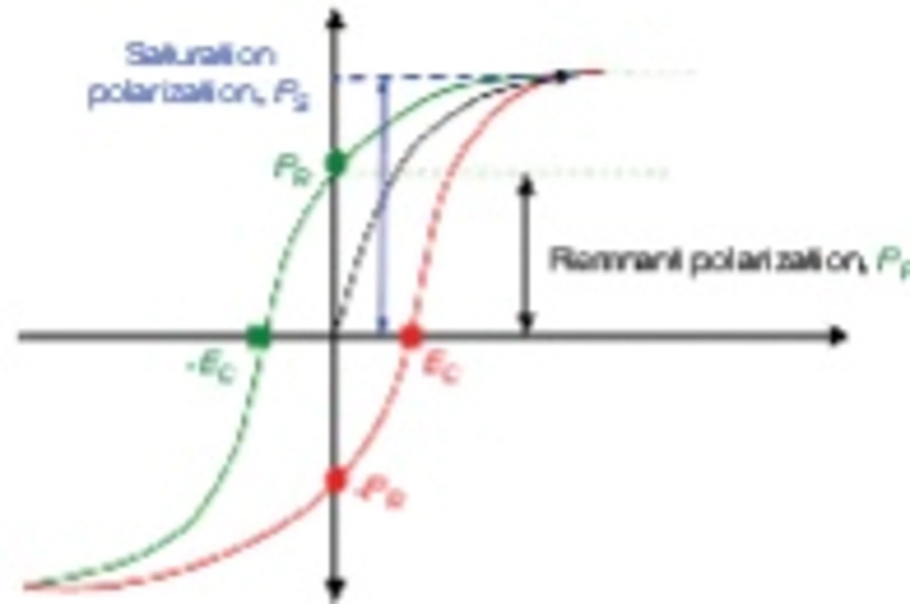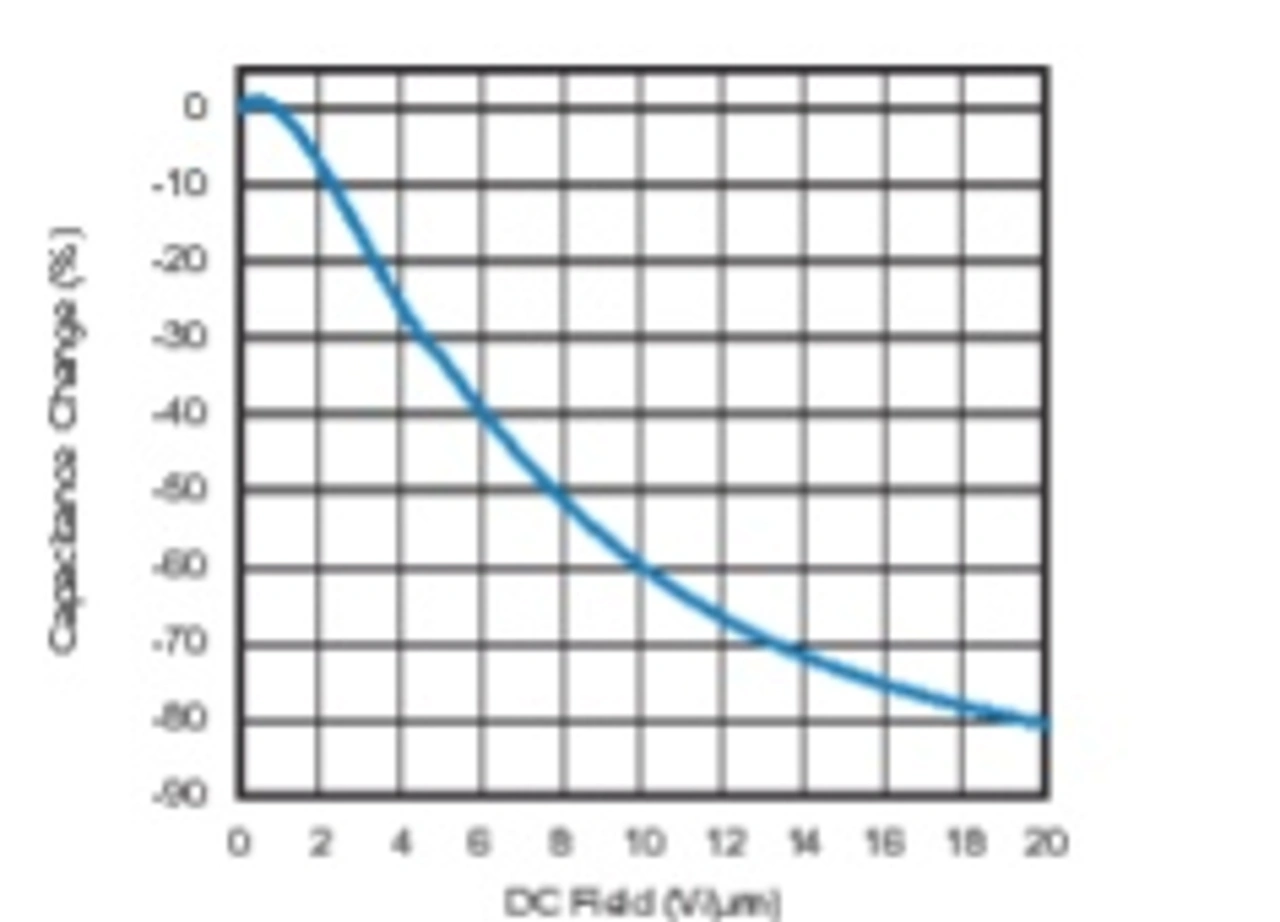 Bei Dielektrika der Klasse II ist die spontane Polarisierung der Keramik und die damit verbundene Bildung von Domänen für die anfänglich hohe Kapazität verantwortlich. Trägt man die Polarisation als Funktion des Erregerfeldes auf wie in Bild 1, erhält man eine Hystereseschleife. Die dargestellte Hysteresekurve ist typisch für Dielektrika auf Bariumtitanatbasis. Anfangs ist die Polarisierbarkeit hoch, aber sie flacht mit zunehmender elektrischer Feldstärke allmählich ab. Infolgedessen nimmt die Kapazität mit zunehmender Vorspannung ab, wie aus dem VCC-Diagramm in Bild 2 ersichtlich ist.