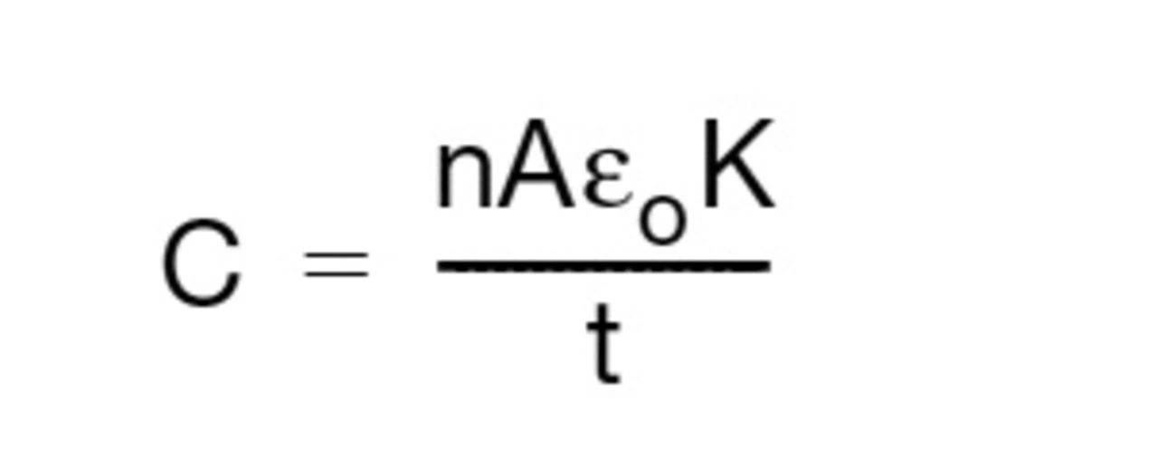 wobei C = Kapazität n = Anzahl der Dielektrikum-Schichten A = Überlappungsfläche jeder leitenden Schicht (m2) ε0 = dielektrische Permeabilität im Vakuum (8,854 · 10–12 F/m) K = Dielektriizitätskonstante t = Abstand der Dielektrikum-Schichten (m)