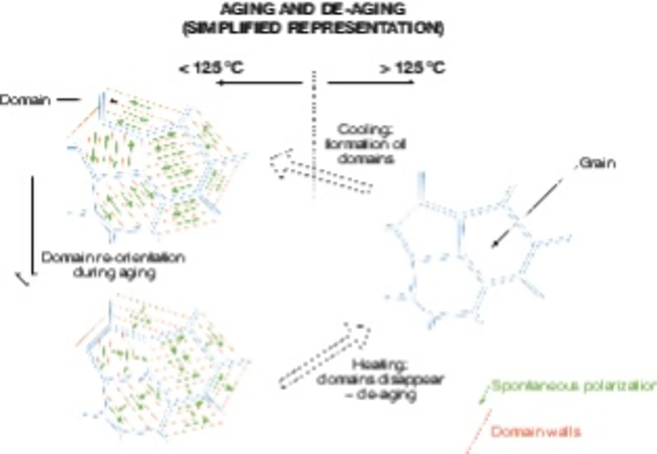 Oberhalb der Curie-Temperatur weist Bariumtitanat eine kubische Struktur auf. In diesem Zustand ist das Dielektrikum nicht ferroelektrisch, und es findet keine spontane Polarisation statt. Beim Abkühlen unter die Curie-Temperatur ändert sich die Kristallstruktur in eine tetraedrische Struktur. Dadurch kann sich das Titan-Atom permanent aus der Mitte des Kristallgitters bewegen, was zu einer permanenten Polarisierung führt. Im Laufe der Zeit ordnen sich die Domänen immer wieder neu an und verringern so die innere Spannung. Diese allmähliche Neuordnung der Domänen führt dazu, dass die Kapazität mit der Zeit abnimmt. Typischerweise folgt die Alterung einem logarithmischen Gesetz, das mathematisch wie folgt beschrieben wird: