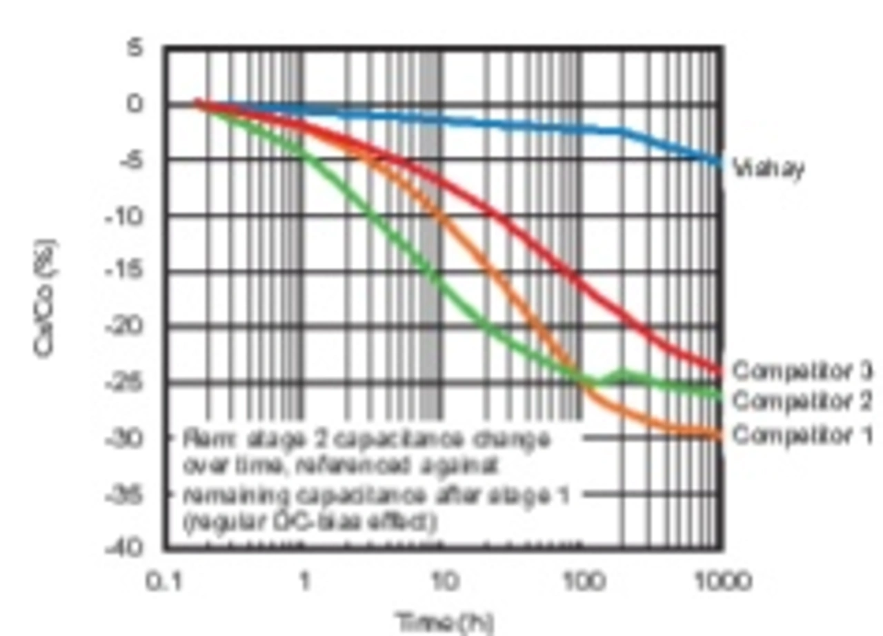 Wie bei einer DC-Vorspannungsbelastung in Höhe von 40 Prozent der Nennspannung führt auch eine 100-Prozent-Belastung von X7R-Kondensatoren zu einer relativ starken Kapazitätsdrift – allerdings sehr viel schneller. Die Wettbewerbsprodukte zeigten aufgrund von DC-Bias-Alterung anfänglich einen wesentlich höheren Kapazitätsverlust als die Kondensatoren von Vishay, die sich auch unter diesen Bedingungen bis zu 100 Stunden lang als stabiler erwiesen. Ab etwa 1000 Stunden DC-Vorspannung verringerte sich dieser Vorteil allmählich. Diese Ergebnisse gelten für DC-Vorspannungsfeldstärken in der Größenordnung von 6 V/μm und mehr.