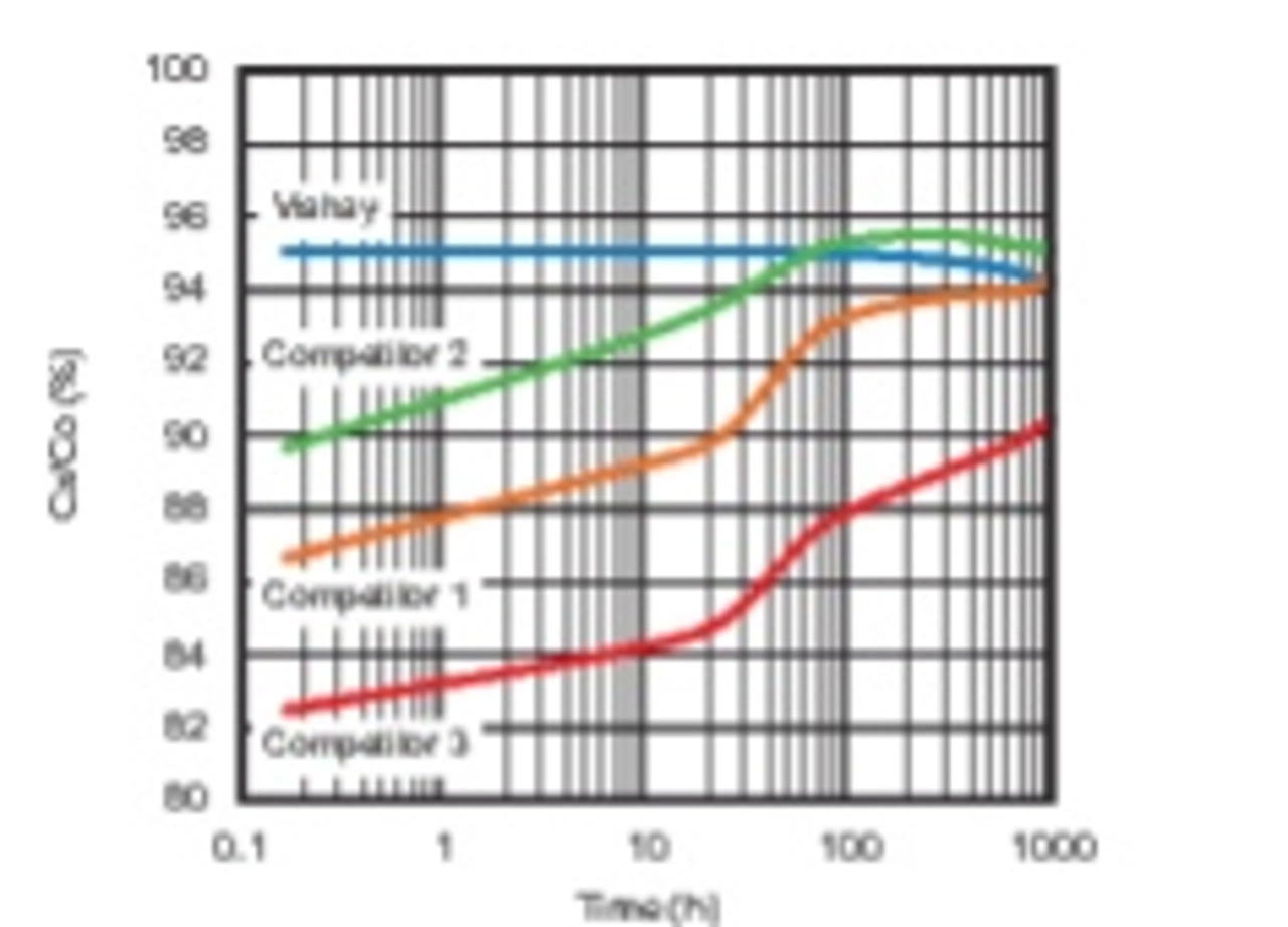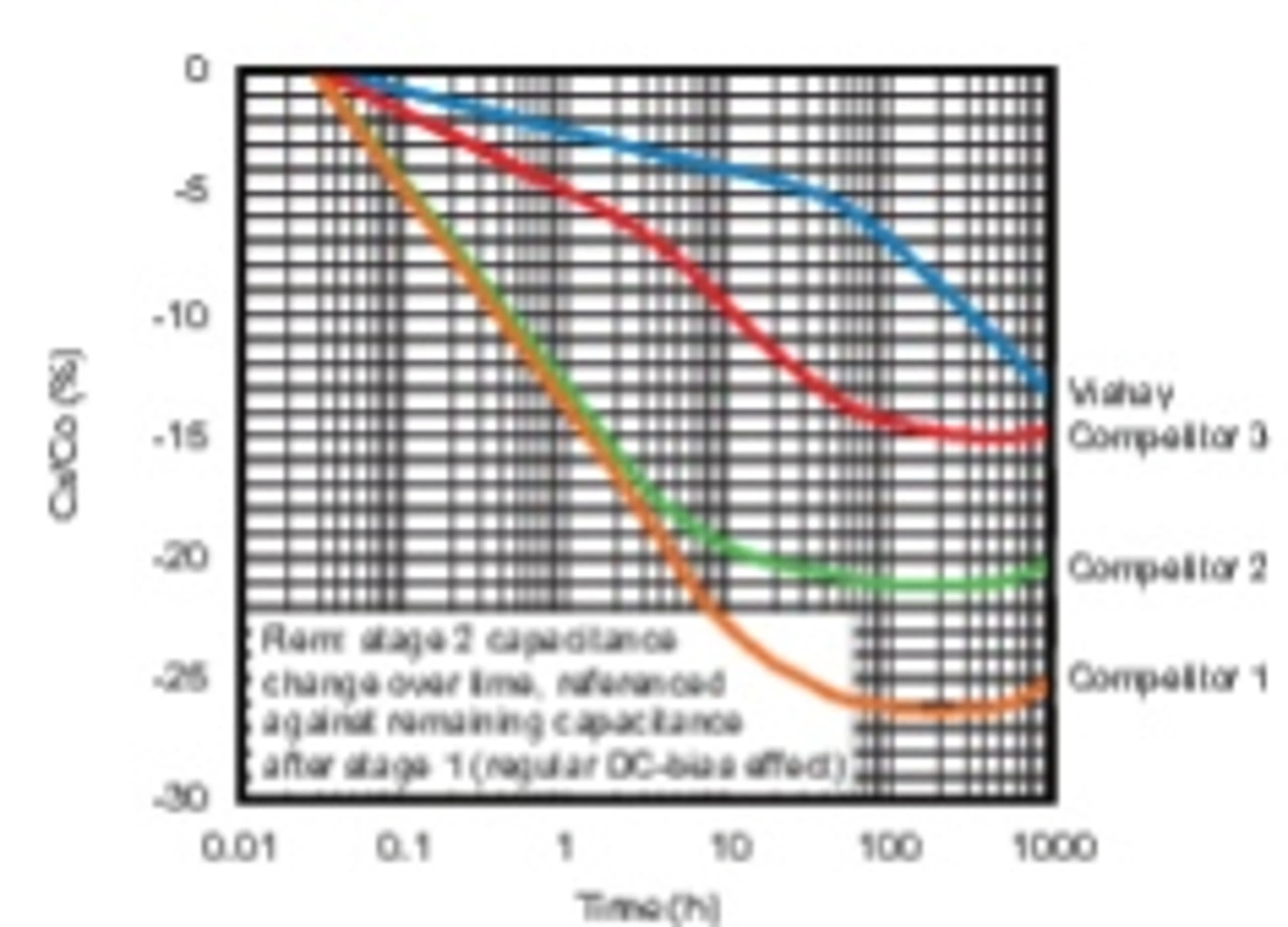 Nach Entfernen der DC-Vorspannung erholten sich die Wettbewerbsprodukte wesentlich langsamer als die Kondensatoren von Vishay, die innerhalb weniger Minuten wieder 95 Prozent ihrer ursprünglichen Kapazität erreichten. Die Wettbewerbsprodukte benötigten für eine Erholung auf 95 Prozent zwischen 50 und 1000 Stunden. Alle getesteten Kondensatoren erholten sich nach einer einstündigen Wärmebehandlung bei 150 °C auf 100 Prozent.