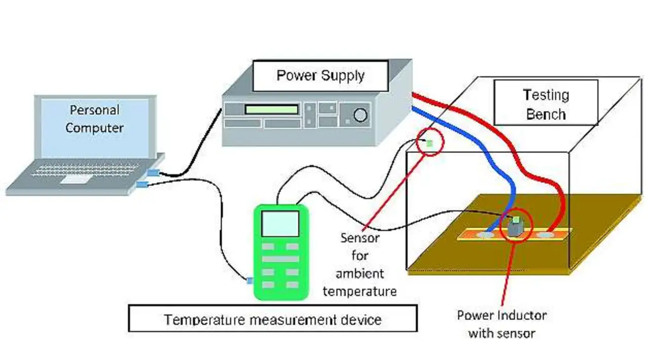 Es bedarf eines definierten Prüfraums, sodass das Messergebnis nicht durch Luftkonvektion verfälscht wird. Der Prüfraum von Würth Elektronik eiSos, wie er in Bild 1 gezeigt wird, ist in Anlehnung an die EN 60512-5-2 aus einem nichtwärmereflektierenden Material gefertigt. Die EN 60512 beschreibt den Test von Steckverbindern für elektronische Einrichtungen. Sie wird als Referenz genutzt, da für Spulen keine derartige Definition vorhanden ist. Ein Thermoelement kontaktiert mittels Wärmeleitpaste die Oberfläche der Spule, wodurch sich die Bauteiltemperatur sehr exakt messen lässt. Dieses Messsystem ist automatisiert und die Stromquelle wird mittels einer speziell hierfür entwickelten Software gesteuert.