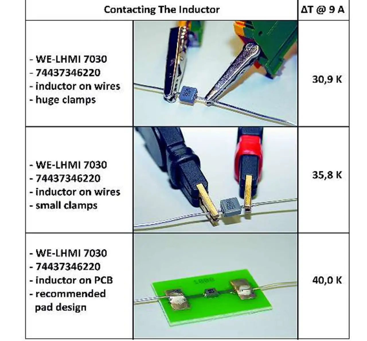 Für diese Vergleichsmessung wird die Spule »74437346220« der Serie »WE-LHMI« von Würth in der Bauform 7030 verwendet und ein Strom von 9 A eingeprägt. Die Art der Kontaktierung beeinflusst das Messergebnis deutlich. Je mehr Masse die Kontakte aufweisen, umso mehr Wärme kann über die Kontakte abgegeben werden und desto geringer ist die relative Temperaturänderung der Spule. Das erste Beispiel aus der Vergleichsmessung zeigt, dass beispielsweise eine WE-LHMI der Baugröße 7030 sich nur um 30,9 K erwärmt, wenn die Spule zur Kontaktierung an Drähte gelötet und über große Prüfklemmen kontaktiert wird. Bei kleineren Klemmen (Bild 2, Mitte) steigt bei gleichem Strom die Temperatur um 35,8 K an. Diese Art der Kontaktierung ist jedoch nicht praxisnah.