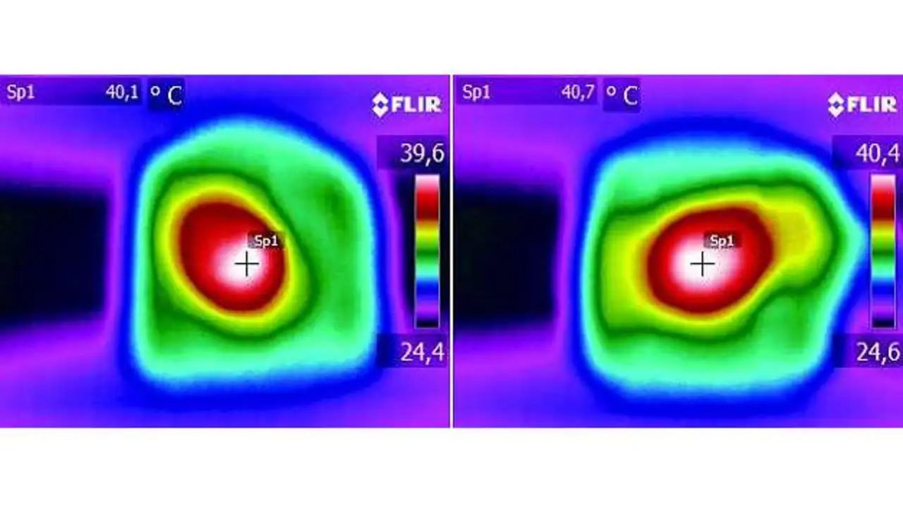 Bild 4 zeigt die Temperatur beider Spulen, gemessen mit einer Wärmebildkamera. Der Temperaturunterschied zwischen beiden Bauteilen beträgt gerade einmal 0,6 K und ist auf Bauteiltoleranzen zurückzuführen. Beide Kennlinien zeigen bei einer Eigenerwärmung von 40 K einen Nennstrom von 9 A. Zusätzlich liegt bei beiden Spulen und gleicher Bauform der gleiche Widerstandswert von 6,7 mΩ zugrunde. Resultierend stellt sich bei beiden Spulen die gleiche Verlustleistung PDC,Loss von 542,7 mW ein.