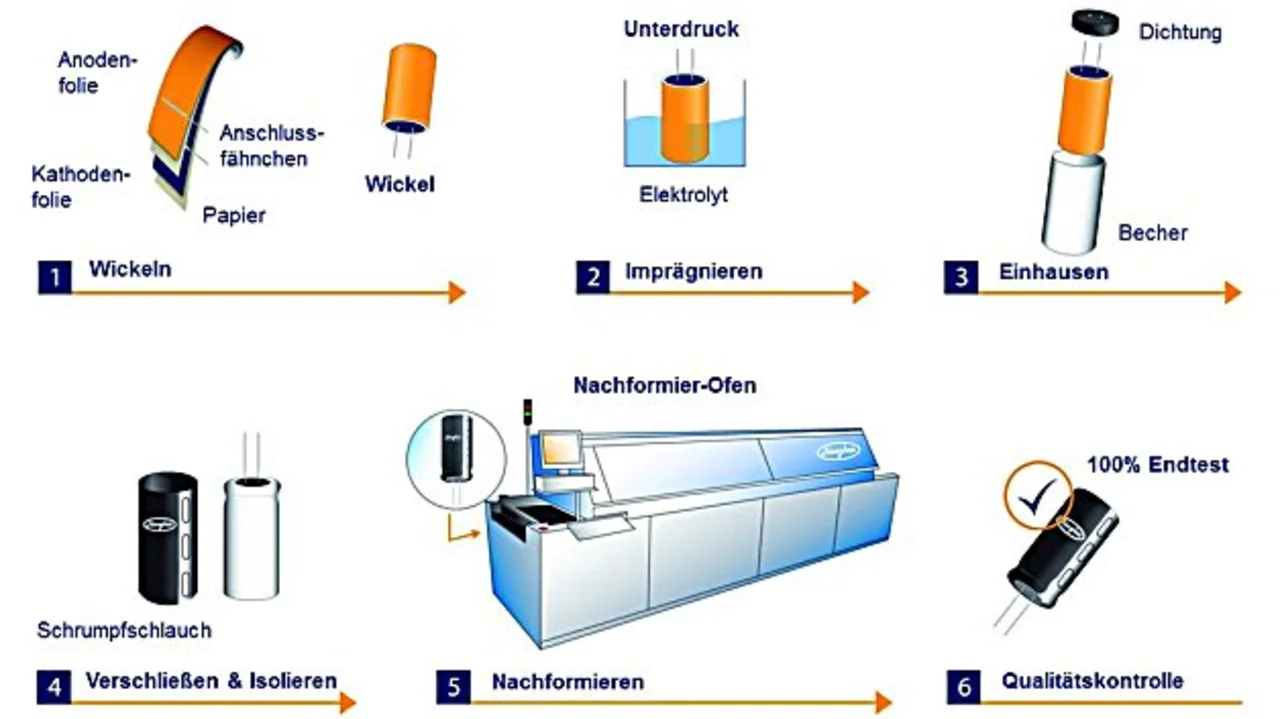 100-Prozent-Qualitätskontrolle (Bild 3, Abschnitt 6) der elementaren Parameter (Kapazität, Verlustfaktor, Leckstrom).