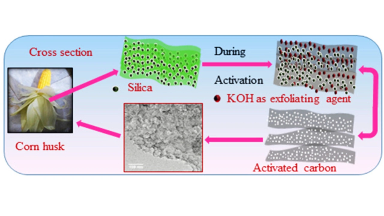 Um aus Maishülsen Aktivkohle mit großer Oberfläche und poröser schichtartiger Morphologie zu erhalten, fügten die Forscher Kaliumhydroxid (KOH) als Aktivierungsmittel hinzu. Dadurch entsteht eine schichtförmige Morphologie. Durch das Zusammenspiel von Morphologie und hoher spezifischer Oberfläche (1378 m²/g) steigt die Speicherfähigkeit des Elektrodenmaterials aus Aktivkohle. Die Speicherkapazität der Aktivkohle wurde unter Verwendung eines Hochspannungselektrolyten (1M Tetra-Ethyl-Ammonium-Tetrafluoroborat (TEABF4) in Acetonitril (AN)) getestet. Dabei zeigte sich eine höhere elektrische Leistungsfähigkeit (20 Wh/kg bzw. 681 W/kg) bei 1 A/g als bei Elektroden in herkömmlichen Superkondensatoren. Die spezifische Kapazität beträgt 80 F/g und es zeichnet sich durch eine gute Zyklenfestigkeit aus. Nach 5000 Zyklen bei 2 A/g beträgt die Kapazität noch 90 Prozent des Anfangswerts.