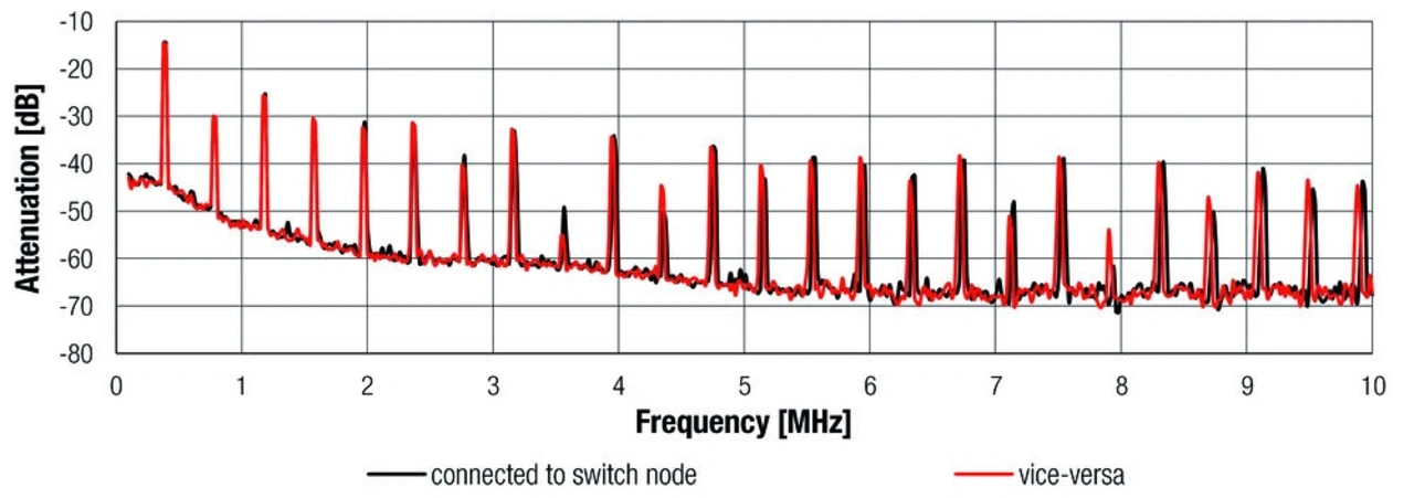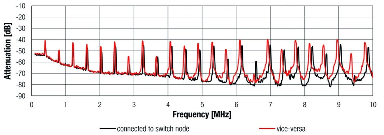 Ein für die EMV wesentlicher Aspekt, der häufig übersehen wird, ist die Orientierung des Wicklungsanfangs. Dieser ist durch einen Punkt auf der Spule markiert (Bild 5). Es ist wichtig, die mit dieser Markierung versehene Spulenseite möglichst nah am Schaltknoten (Switch Node in Bild 1) anzuschließen, da dort der höchste du/dt-Wert auftritt und dadurch Störeinflüsse hier am stärksten sind. Auf diese Weise schirmen die äußeren Wicklungen das hohe du/dt ab. Wird dagegen das unmarkierte Ende mit dem Schaltknoten verbunden, liegt das hohe du/dt an der äußeren Wicklung. Dies kann zu elektrischen oder kapazitiven Kopplungen inakzeptabler Stärke führen.
