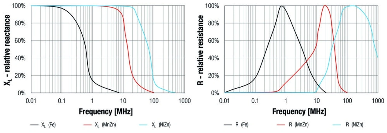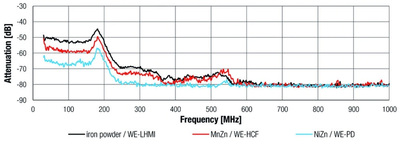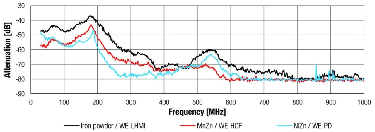 Aufgrund der Schwingungen am Schaltknoten, der schnellen Übergänge und der hohen Schaltfrequenz ist eine geeignete Spule auszuwählen, um die EMV zu gewährleisten. Normalerweise liegt die Ringing-Frequenz im Bereich zwischen 100 MHz und 200 MHz. Geschirmte Spulen sind häufig so ausgelegt, dass die Schaltgrundfrequenz, nicht aber die höheren Ringing-Frequenzen abgeschirmt werden. Wie wirksam die Abstrahlung in diesen Frequenzbereichen abgeschwächt wird, hängt in hohem Maße von den Eigenschaften der Spule ab – vor allem vom Kernmaterial (Bild 9) und dessen Dicke.
