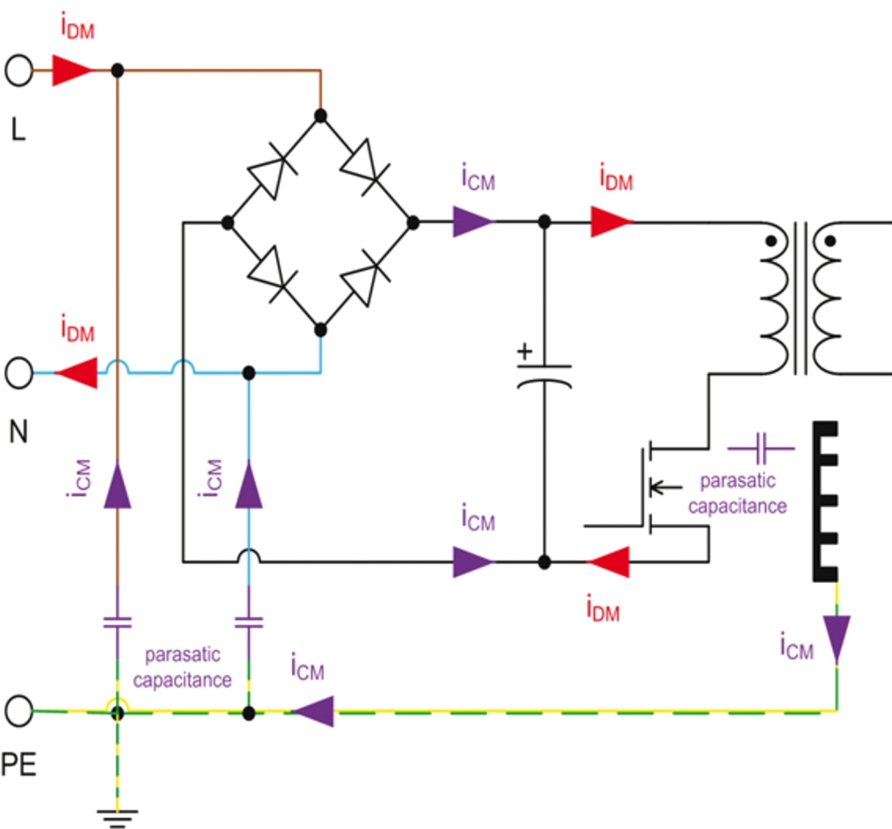 Zur Kühlung wird der MOSFET auf einem Kühlkörper montiert, der wiederum an den Schutzleiter PE angeschlossen ist. An dieser Stelle kommt es zur kapazitiven Kopplung zwischen dem Kühlkörper und dem Drain des MOSFETs und erzeugt eine Gleichtaktstörung (Common Mode). Kapazitiv gekoppelt fließt nun ein Gleichtaktstrom iCM über die Erdleitung PE zurück zum Schaltnetzteileingang, wo er wieder über parasitäre Kapazitäten sowohl auf die Netzleitung L, als auch auf die Neutralleitung N gekoppelt wird. Der Gleichtaktstrom iCM fließt nun wie in Bild 1 gezeigt über beide Netzleitungen, über die Gleichrichterbrücke zum MOSFET, wo er sich wieder parasitär über den Kühlkörper auf die Erdleitung PE einkoppelt.
