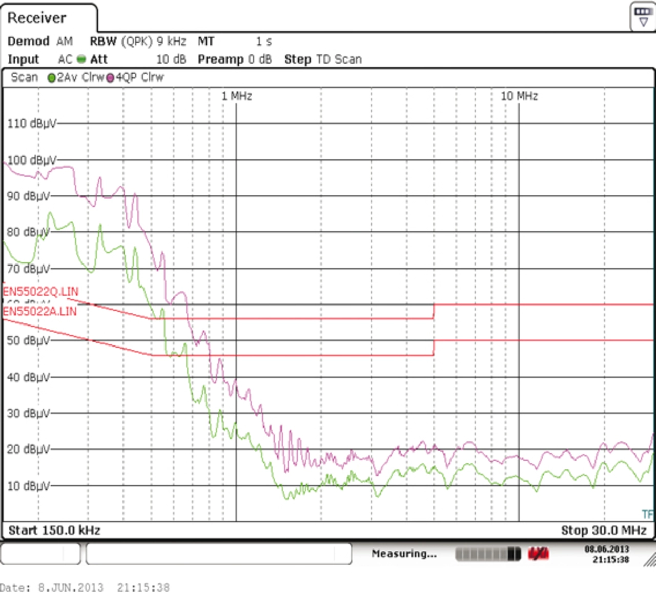 Bild 2 zeigt das Ergebnis der Messung der leitungsgebundenen Funkstörspannung dieses Schaltnetzteils ohne Netzfilter. Deutlich zu erkennen ist, dass das Schaltnetzeil ein Netzfilter benötigt.
