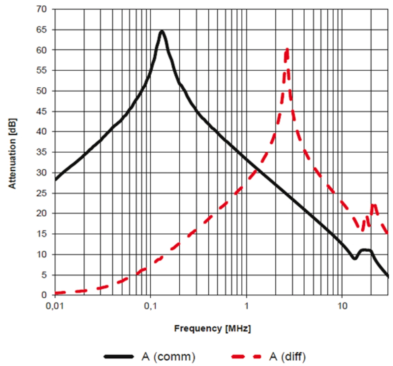 Bild 5 zeigt die Kennlinie ihrer Einfügedämpfung im 50-Ω-System. In der Einfügedämpfung unterscheidet man stets zwischen der Gleichtakt- (schwarze Linie) und Gegentaktunterdrückung (rote gestrichelte Linie). Die Netzdrossel WE-CMB erreicht im Gleichtaktbetrieb ihre höchste Einfügedämpfung bei 150 kHz. Diese Dämpfung fällt jedoch mit steigender Frequenz.