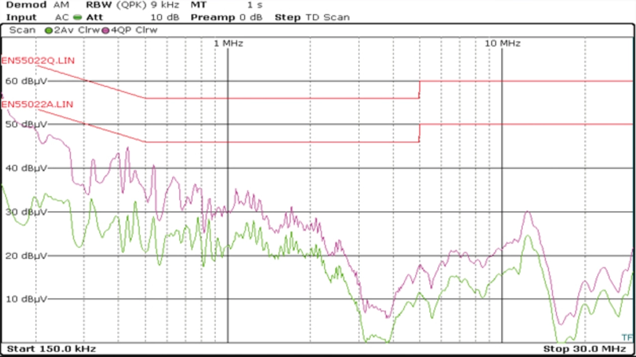 Bild 6 zeigt das Ergebnis der Messung mit diesem Netzfilter. Nun wird die EMV-Prüfung der Funkstörspannung bestanden. Bei der untersten Frequenz von 150 kHz liegt ein Störsicherheitsabstand von mindestens 10 dB bei Quasi-Peak vor. Im weiteren Frequenzbereich liegen Quasi-Peak und Average-Peak weit unter dem zulässigen Störpegel.