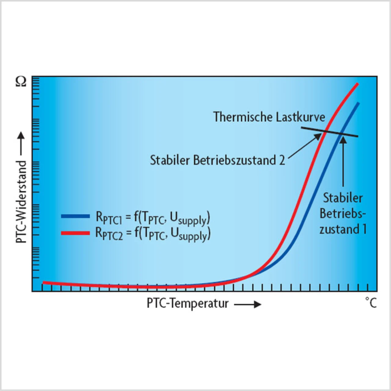 Der Energiebedarf des Motorstart-PTC lässt sich aus der Differenz von PTC-Temperatur zur Umgebungstemperatur und dem thermischen Gesamtwiderstand des PTC-Elements zu seiner Umwelt ermitteln.