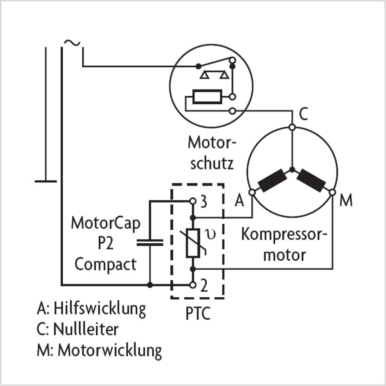 Diese wird über einen PTC-Widerstand beschaltet. Der Kaltleiter auf Keramikbasis (Bariumtitanat) hat einen stark nichtlinearen – ab einer charakteristischen Keramiktemperatur sprunghaft ansteigenden – Widerstandsverlauf. Dadurch ist der Kaltleiter als Abschaltverzögerungselement einsetzbar. Kaltleiter in dieser Anwendung werden auch als Motorstart-PTCs bezeichnet. Durch die Schaltung eines MotorCap P2 Compact in Serie zu der Hilfswicklung wird diese zu einem aktiven Teil des Motors.