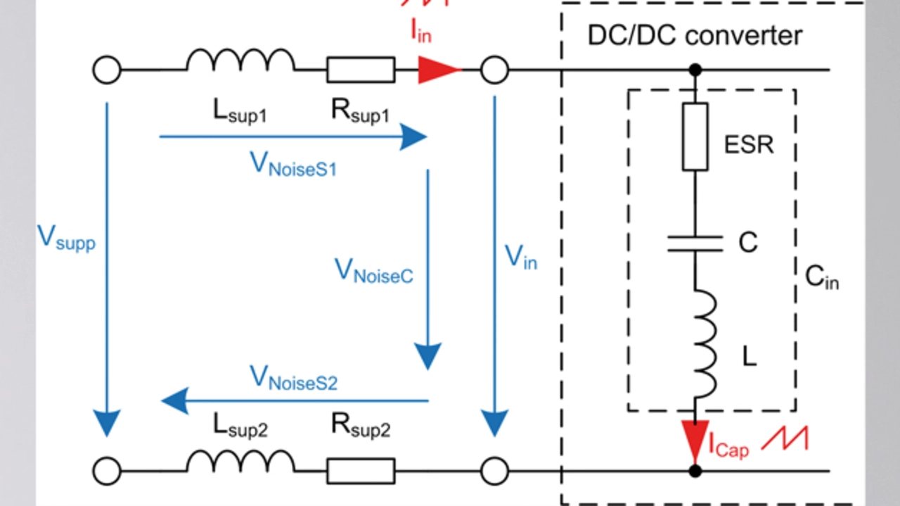 Getaktete Stromversorgungen, also auch DC/DC-Wandler, erzeugen elektromagnetische Störspannungen. Gegentaktstörungen (Differential Mode Noise) sind Störsignale in einem System mit symmetrischem Stromfluss hin und zurück zur Quelle (Source) in den Zuleitungen eines Schaltreglers. Im Eingangskreis fließt mit der Taktfrequenz des Power-Moduls ein dem Nutzstrom überlagerter Wechselstromanteil und ähnelt im Abbild dem Strom, der durch die Speicherinduktivität des Power-Moduls fließt. Der Eingangsstrom fließt in den Eingangskondensator Cin. Reale Kondensatoren verfügen über einen resistiven Anteil, den effektiven Serienwiderstand ESR, und einen induktiven Anteil, dem ESL. Der Wechselstromanteil führt über dem ESR des Eingangskondensators und den Impedanzen der Zuleitungen des Power-Moduls zu einem unerwünschten Spannungsabfall (Bild 1).