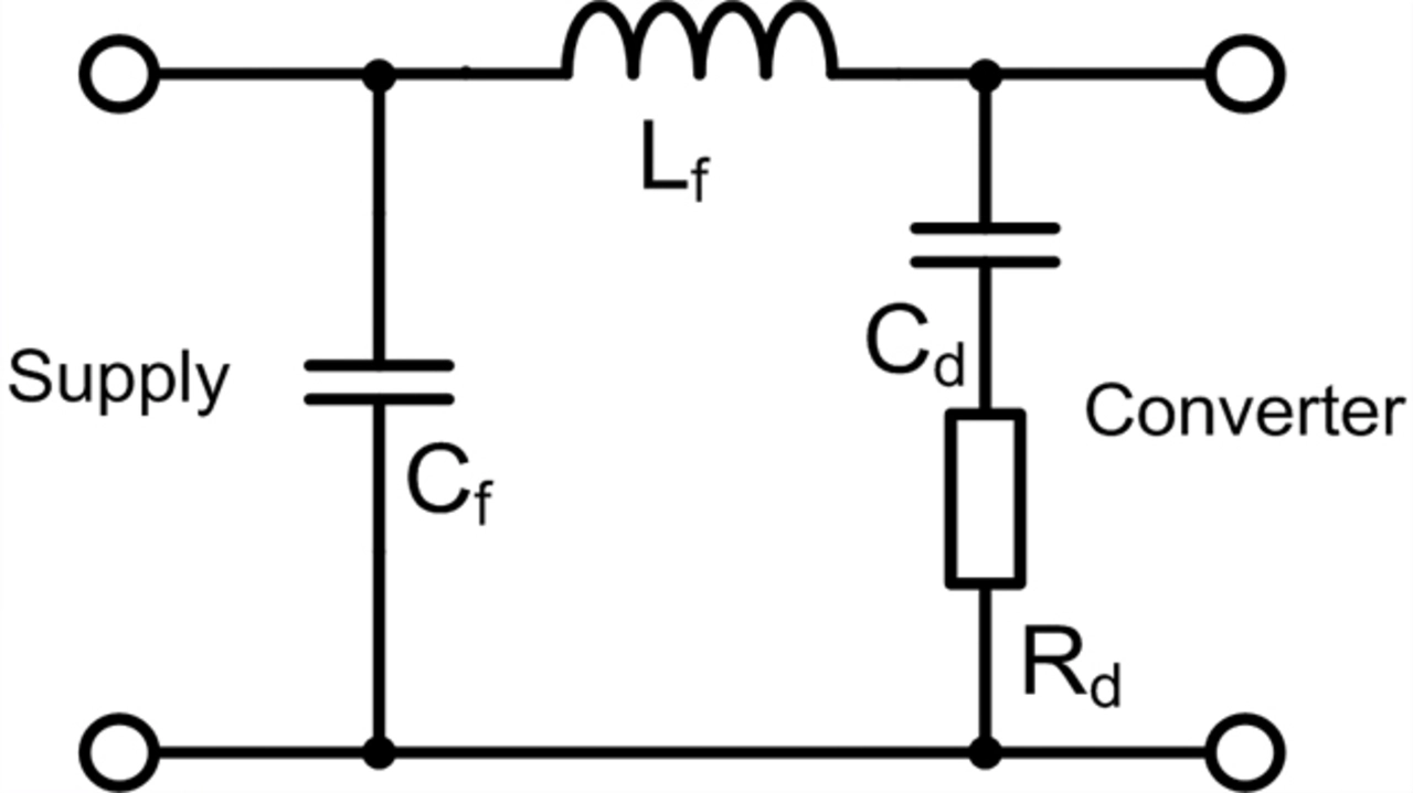 Um die Gegentaktstörungen zu reduzieren, ist mindestens ein einfacher LC-Filter am Eingang des Wandlers erforderlich. Solch ein Eingangsfilter dämpft in hochohmigen Systemen theoretisch die Störspannung mit 40 dB/Dekade im Sperrbereich. In der Praxis wird eine geringere Dämpfung erreicht, weil die Abschlussimpedanzen eher niederohmiger Natur sind und außerdem die Bauteile selbst Verluste aufweisen. Zur Dimensionierung des LC-Filters wird eine Eckfrequenz fc gewählt, die unter der Schaltfrequenz fsw des Power-Moduls liegt. Ist der Faktor ein Zehntel, wird bei der Schaltfrequenz, bei der die höchste Spektralamplitude auftritt, theoretisch eine Einfügedämpfung von 40 dB erreicht. Die Eckfrequenz eines LC-Filters lässt sich allgemein nach Gleichung (1) bestimmen, zur Berechnung des Filters wird beispielsweise eine Induktivität von 10 µH gewählt und Gleichung (1) nach Cf umgestellt (Gleichung (2)).