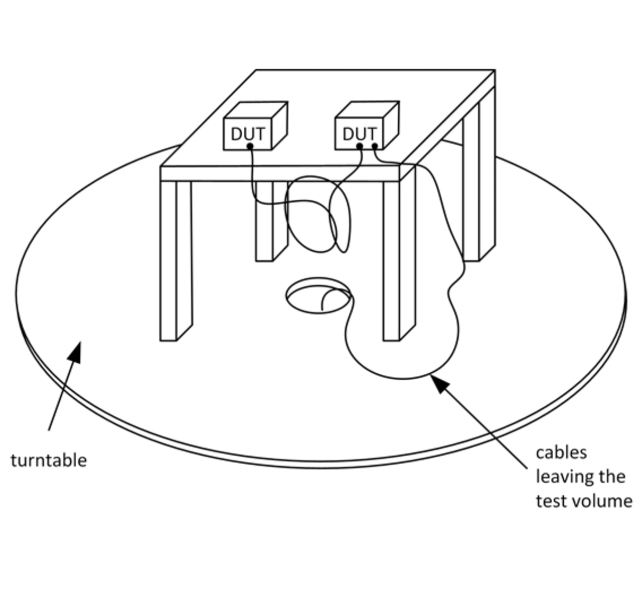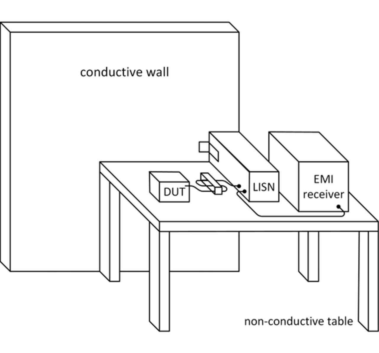 Bei einem Messaufbau für Tischgeräte (Bild 7) befindet sich das Prüfobjekt (DUT) auf einem nicht leitfähigen Tisch, der auf einer Bezugsmasseplatte steht. Die Höhe des Tisches soll 40 cm betragen. Ist zusätzlich auch eine vertikale Bezugsmasseplatte vorhanden, soll der Tisch mindestens 80 cm hoch sein. Die Netznachbildung muss gut leitend mit der Masseplatte verbunden sein. Das Prüfobjekt selbst und daran angeschlossene Kabel sind im Abstand von 40 cm zur Masseplatte anzuordnen. Die Leitungslänge zwischen Prüfobjekt und Netznachbildung soll 80 cm nicht überschreiten. Der Funkstörmessempfänger bewertet die unsymmetrische Störspannung, die an der Netznachbildung für die einzelnen Adern des Kabels ausgekoppelt wird.