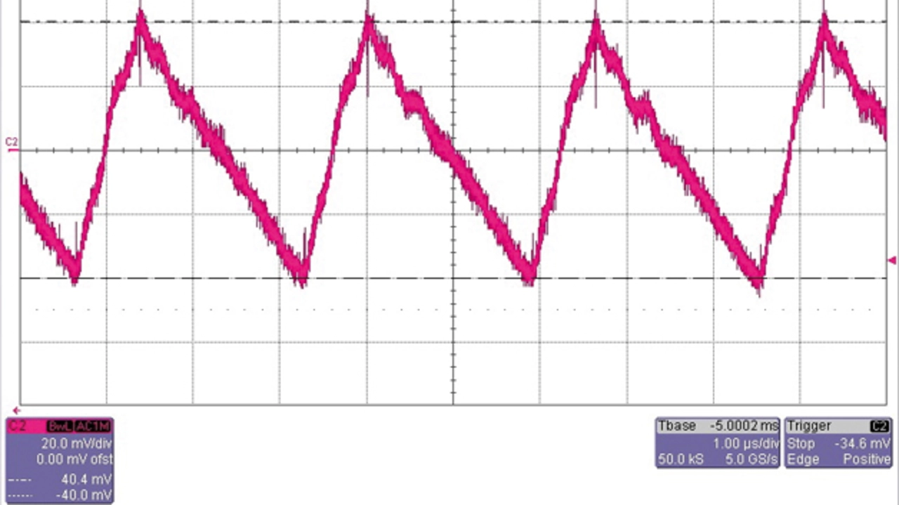 Bild 9 zeigt einen Wechselspannungsanteil von 80 mV, gemessen bei einer Eingangsspannung des Power-Moduls von 7,5 V, einem mittleren Eingangsstrom von 1,2 A und einem mittleren Laststrom von 2 A. Schaltregler haben die Eigenschaft, aus Sicht der Spannungsversorgung einen negativen differenziellen Widerstand darzustellen [6], denn der Eingangsstrom steigt mit sinkender Eingangsspannung. Aus diesem Grund wird die Funkstörspannung unter Worst-Case-Bedingungen – minimale Eingangsspannung, maximale Last – gemessen.