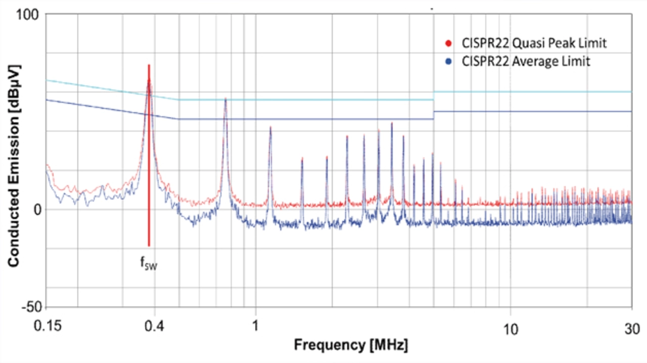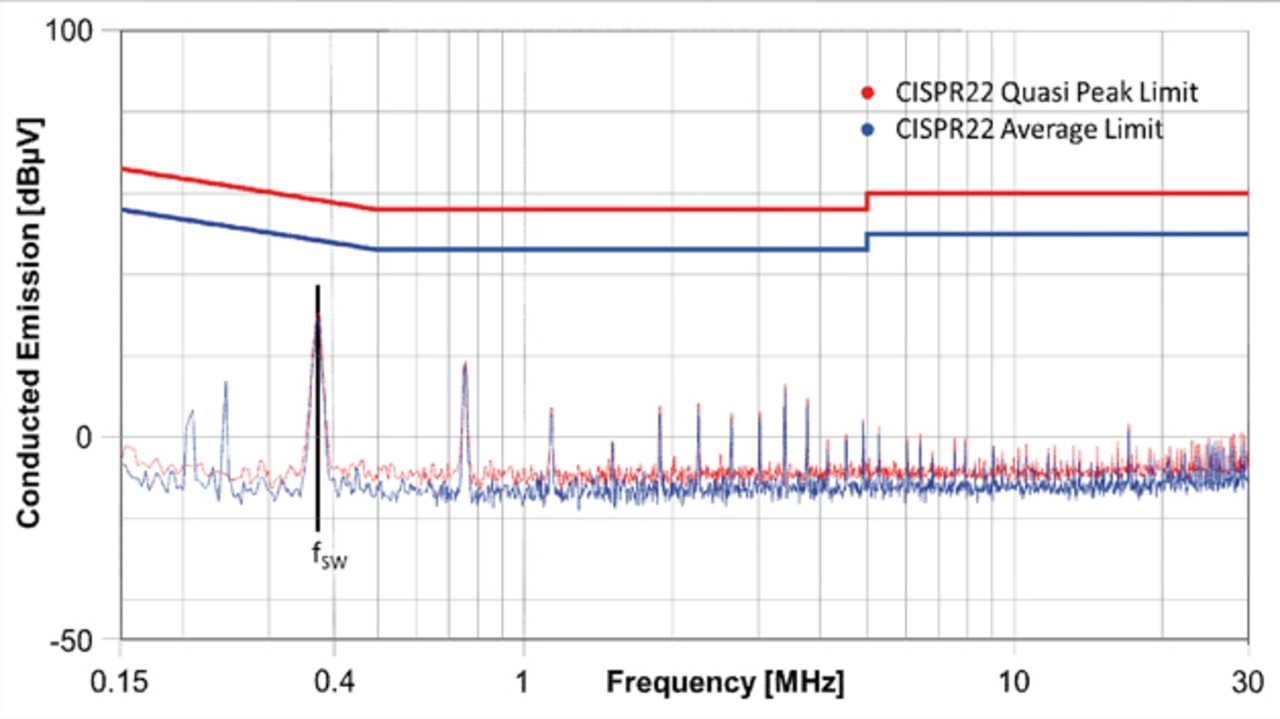 Bild 10b zeigt das Ergebnis der Funkstörspannungsmessung mit dem eingebauten Filter. Der gemessene Störpegel bei der Schaltfrequenz 370 kHz hat einen Wert von 30 dBµV, die Pegel aller Oberwellen sind kleiner als 20 dBµV und damit ausreichend bedämpft. Der Mittelwertpegel bei 370 kHz entspricht dem Spitzenwertpegel und liegt 18 dB unter dem Mittelwertlimit von 47 dBµV. In der Praxis ist bei einer Messung solcher leitungsgebundener Störungen ein Störabstand in dieser Größenordnung vollkommen zufriedenstellend, um für diese Messung die Konformität zu bestätigen.