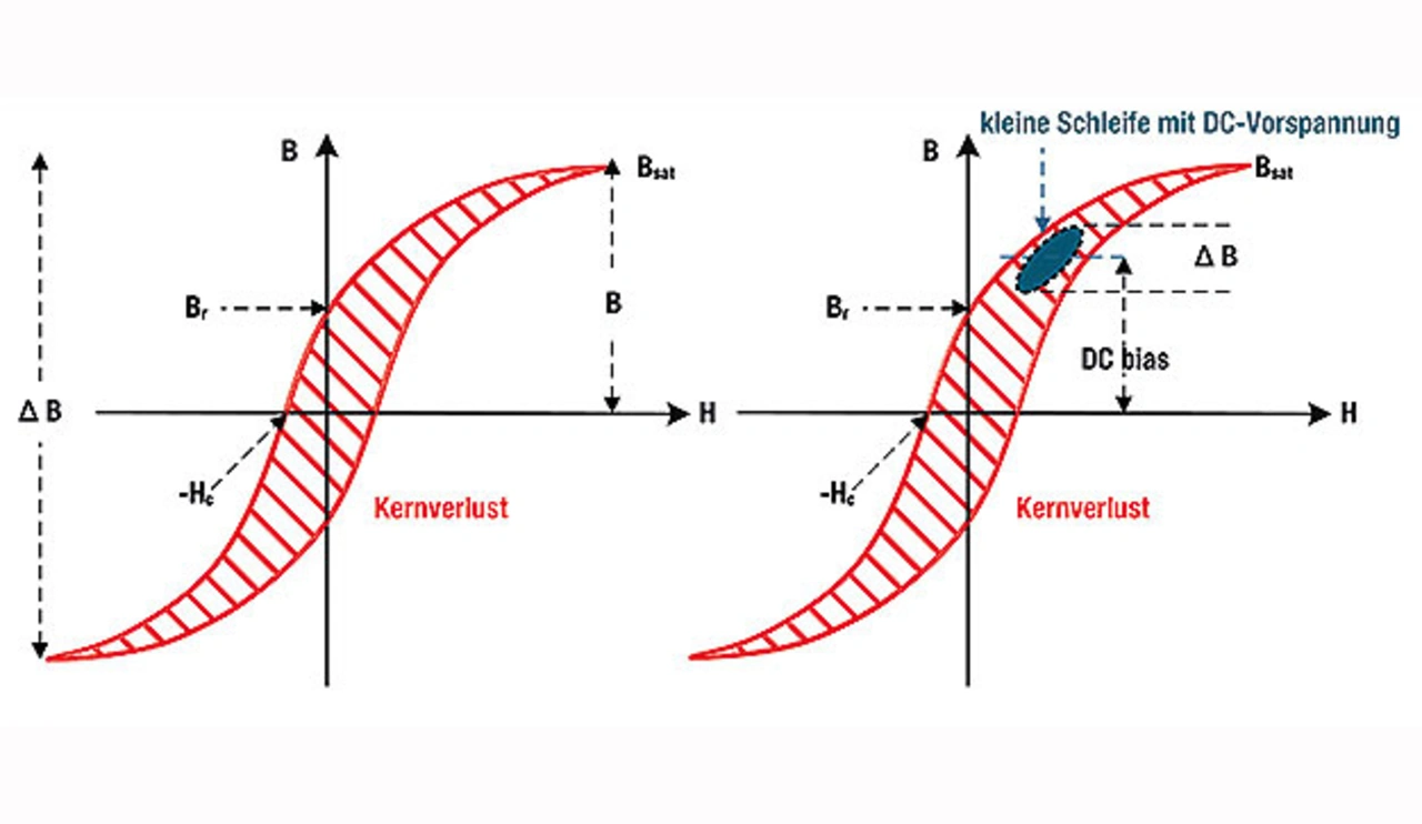 Der dritte Faktor, der zu den AC-Verlusten beiträgt, ist die DC-Vorspannung (DC Bias). Auf den ersten Blick erscheint dies unlogisch, da ein statischer Strom außer der anfänglichen Änderung eine Domänenwand nichts bewegt. Wenn jedoch ein Wechselstrom mit einem Gleichanteil beaufschlagt wird (z. B. als Restwelligkeit einer Gleichspannung), verschiebt sich eine kleine Hysteresekurve an eine andere Position entlang der vollen B/H-Kurve (Bild 1b). Je nach Position kann sich dadurch ihre Form und damit der von der Schleife eingeschlossene Bereich ändern, was in der Regel die Hysterese-Verluste erhöht. Dies kann dazu führen, dass eine Drosselspule unerwartet heiß wird. Herkömmliche Methoden, um die AC-Kernverluste zu berechnen, berücksichtigen dies nicht, was die Überraschung beim Anwender noch vergrößern kann.