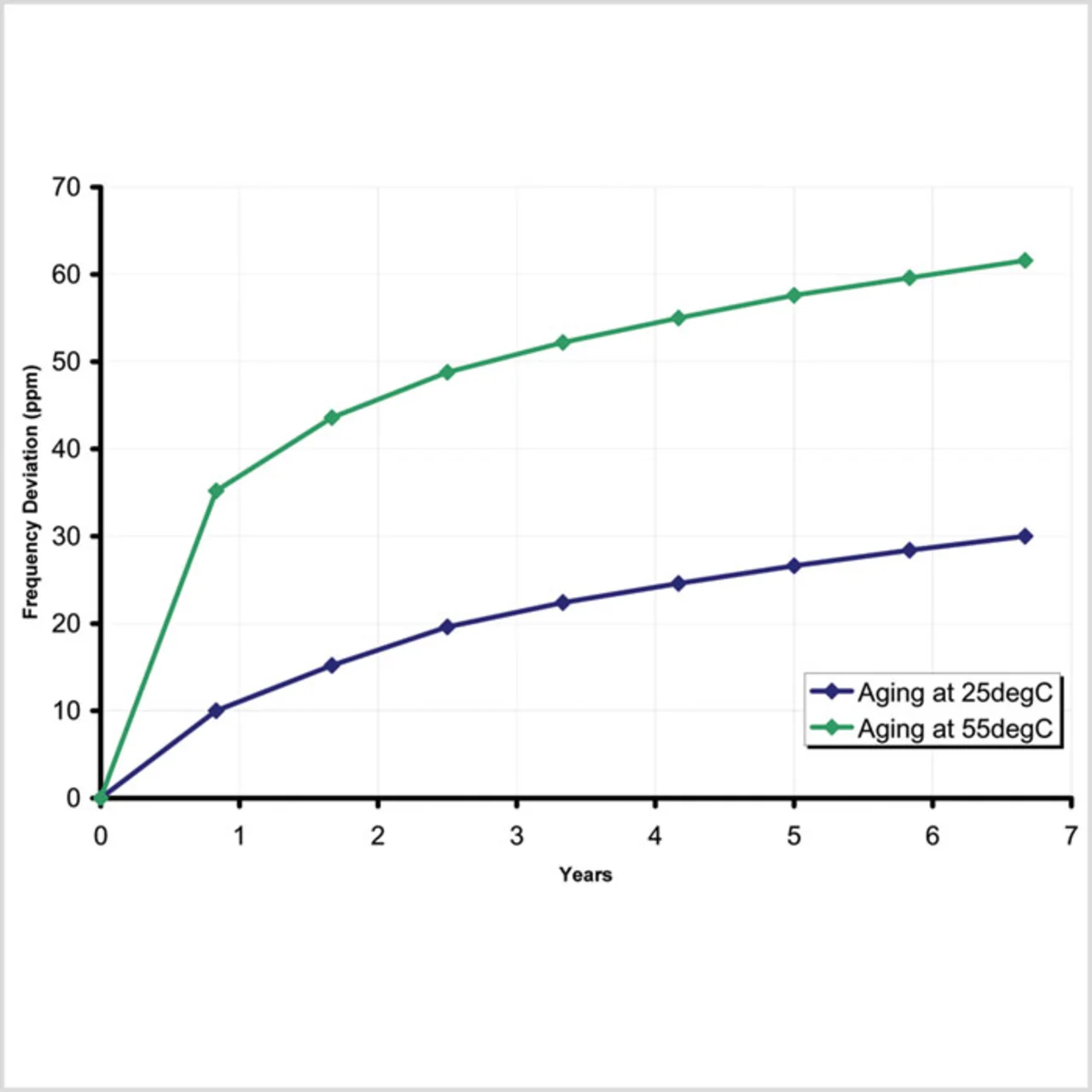Die Frequenzdrift des Si500 verhält sich ähnlich wie andere Alterungsvorgänge bei Halbleitern. Diese Vorgänge sind gründlich erforscht und folgen der Arrhenius-Gleichung für Reaktionsraten. Für die Frequenzalterung des Si500 wurde eine Aktivierungsenergie von etwa 0,7 eV nachgewiesen, was dem Wert von anderen gängigen Reaktionsraten in Halbleitern entspricht. Nach Arrhenius lässt sich die Alterung für verschiedene Betriebstemperaturen aus Qualifizierungsdaten bei höheren Temperaturen abschätzen (Bild 5).