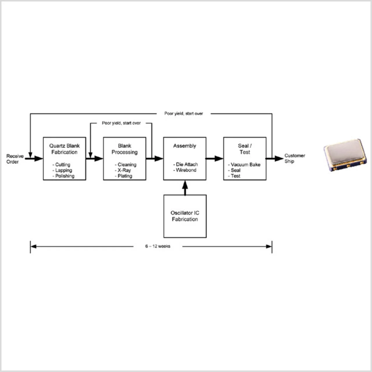 Quarzoszillatoren erfordern für jede Frequenz einen eigenen Quarzresonator. Dazu muss der Hersteller den Quarz schneiden, röntgen, polieren, montieren und in einem Gehäuse versiegeln (Bild 1). Bei Frequenzen über 100 MHz wird diese Aufgabe zunehmend schwieriger, da ein Resonator innerhalb enger Toleranzen zu fertigen ist. Der komplexe Fertigungsprozess führt zu einer schlechten Ausbeute (Yield) bei bestimmten Prozessschritten, was zu erneuten Materialaufwendungen und Verzögerungen führt. Dieser Built-to-Order-Prozessfluss erschwert es den Oszillatoranbietern, statistische Qualitätskontrollen oder kontinuierliche Verbesserungsmaßnahmen einzuführen, da er jede Oszillatorfrequenz als eigenständiges, separates Produkt betrachten muss. Dies führt zu langen, nicht vorhersagbaren Lieferzeiten, vor allem bei kundenspezifischen Frequenzen, die der Hersteller nicht in Massenfertigung bietet.