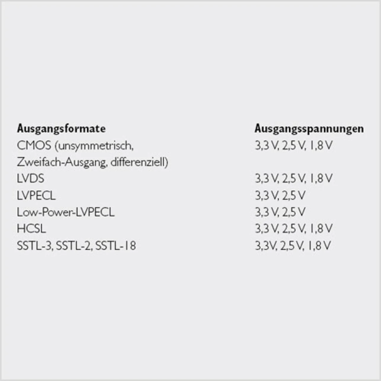 Da der Si500 Frequenzen über einen großen Bereich generieren kann (0,9 MHz bis 200 MHz), muss der Ausgangspuffer eine einfache Anbindung an die vielen gängigen Empfängerformate und Spannungen in diesem Bereich ermöglichen. Der Si500 bietet einen programmierbaren Ausgangspuffer, der differenzielle und unsymmetrische Formate (single ended) unterstützt (Tabelle 2). Gleichzeitig vereinfacht er den Designaufwand, da übliche externe Bauteile bereits integriert sind. Bestehende Oszillatorlösungen unterstützen entweder CMOS für niedrigere Frequenzen (unter 150 MHz) oder LVPECL für höhere Frequenzen (40 MHz bis 200 MHz). Da der Si500 von Haus aus mehrere Formate und Spannungen unterstützt, erübrigen sich externe Puffer und Pegelumsetzer.