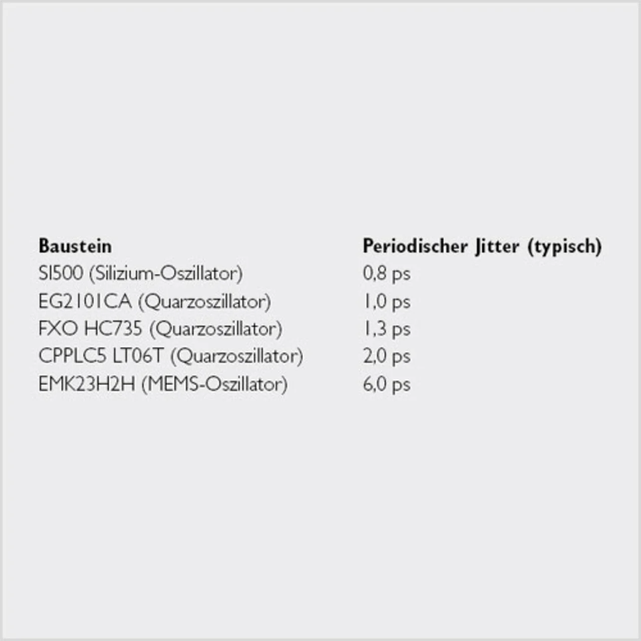 Der Perioden-Jitter hängt mit dem Phasenrauschen [2, 3] zusammen und wird bei großen Offset-Frequenzen, die bis zur Hälfte der Taktfrequenz betragen können, oft durch selbiges dominiert. Bei solch großen Offsets ist die Performance des Ausgangspuffers für das Phasenrauschen ausschlaggebend, nicht mehr die Güte Q des Oszillators. Daher ist eine rauscharme Ausgangsstufe erforderlich, um einen niedrigen Perioden-Jitter zu erhalten. Tabelle 1 vergleicht den Perioden-Jitter verschiedenen Taktbauelemente. Diese Werte sind eine direkte Folge der Netzstörunterdrückung (Power Supply Rejection Ratio, PSRR, Bild 7).