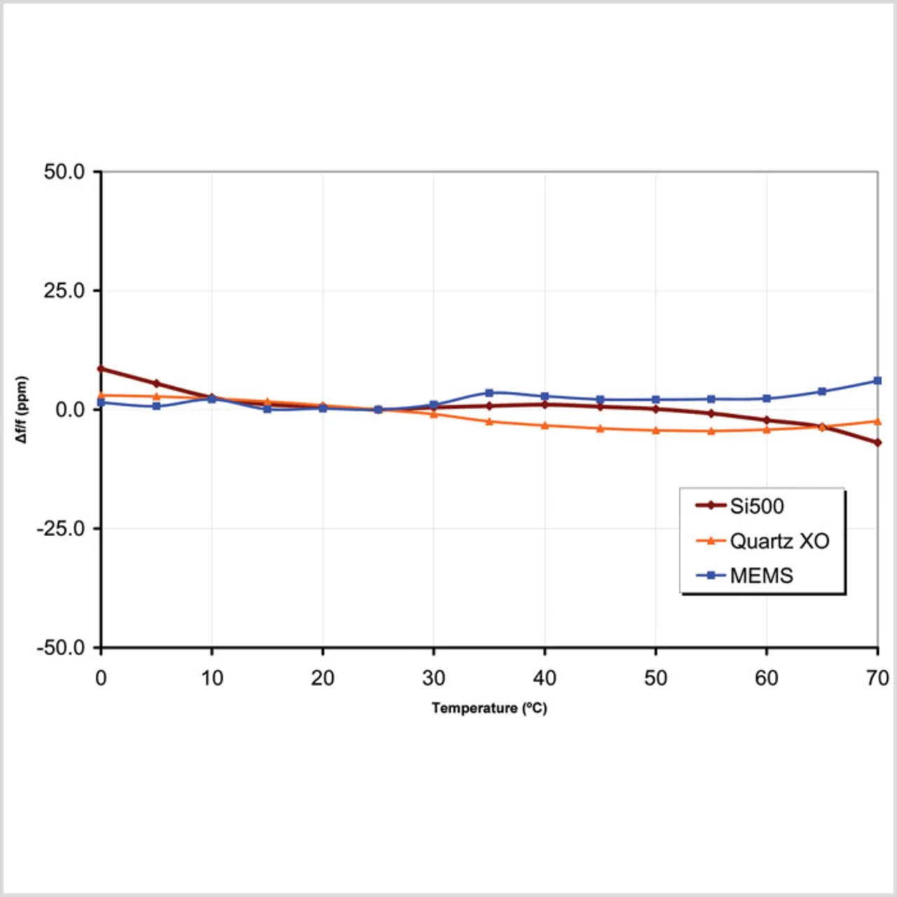 Die Temperaturstabilität eines Oszillators bezieht sich auf die Frequenzänderung über dem Betriebstemperaturbereich des Bausteins. Der Si500 erreicht durch dynamische Temperaturkompensation eine Temperaturstabilität von typisch ±10 ppm. Dies entspricht der Leistungsfähigkeit eines Quarzoszillators.